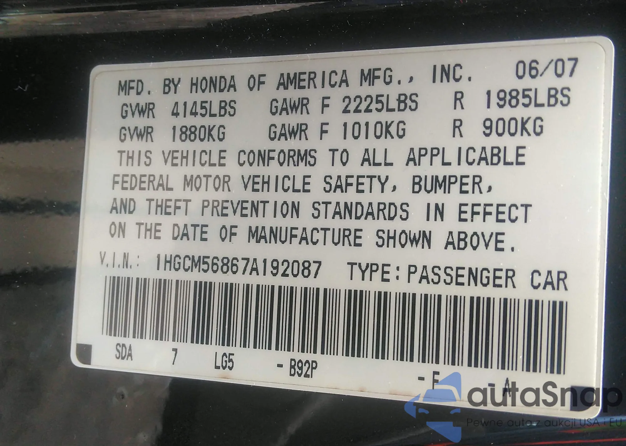 LOT: 42556574 VIN: 1HGCM56867A192087