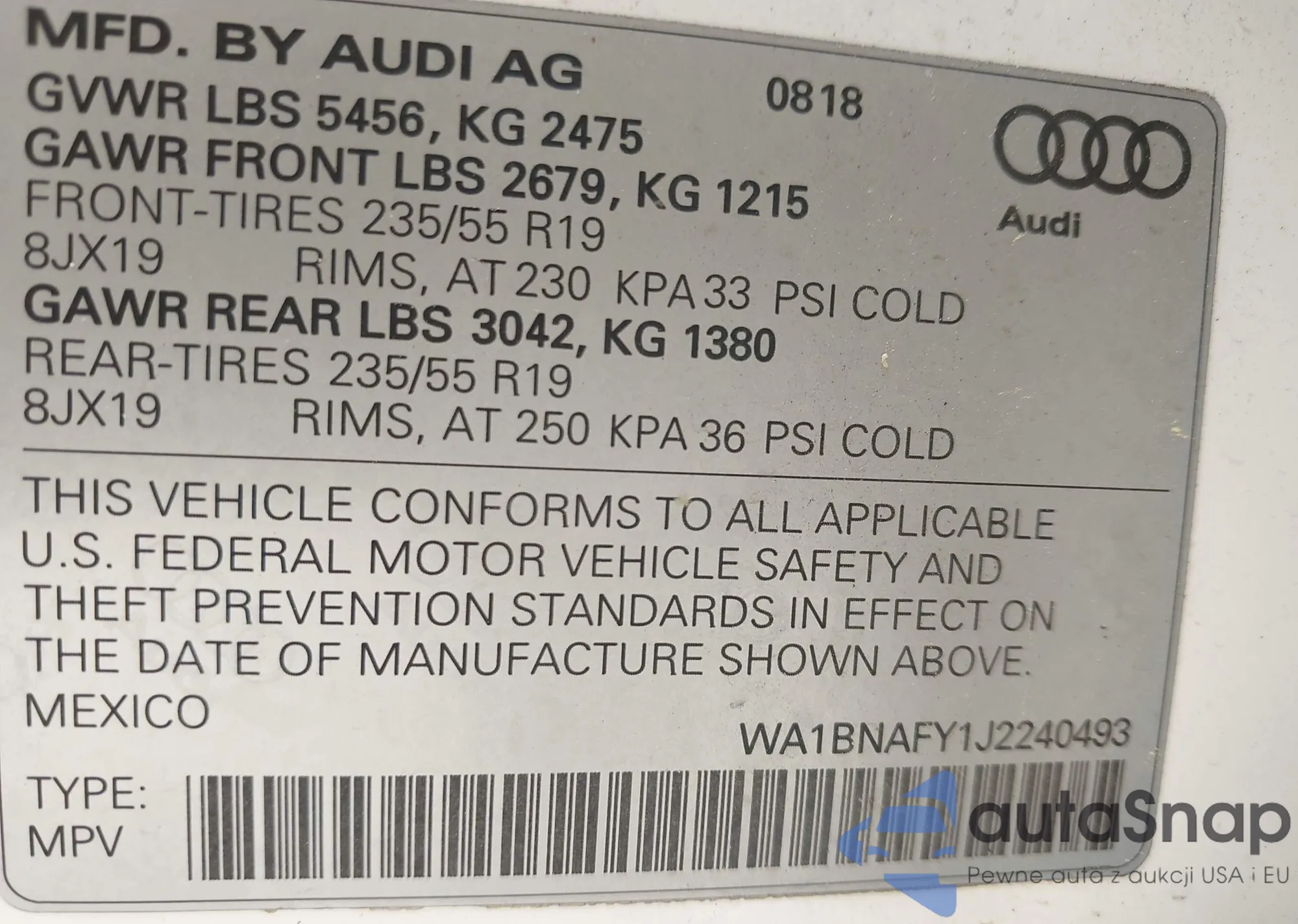 LOT: 42394446 VIN: WA1BNAFY1J2240493