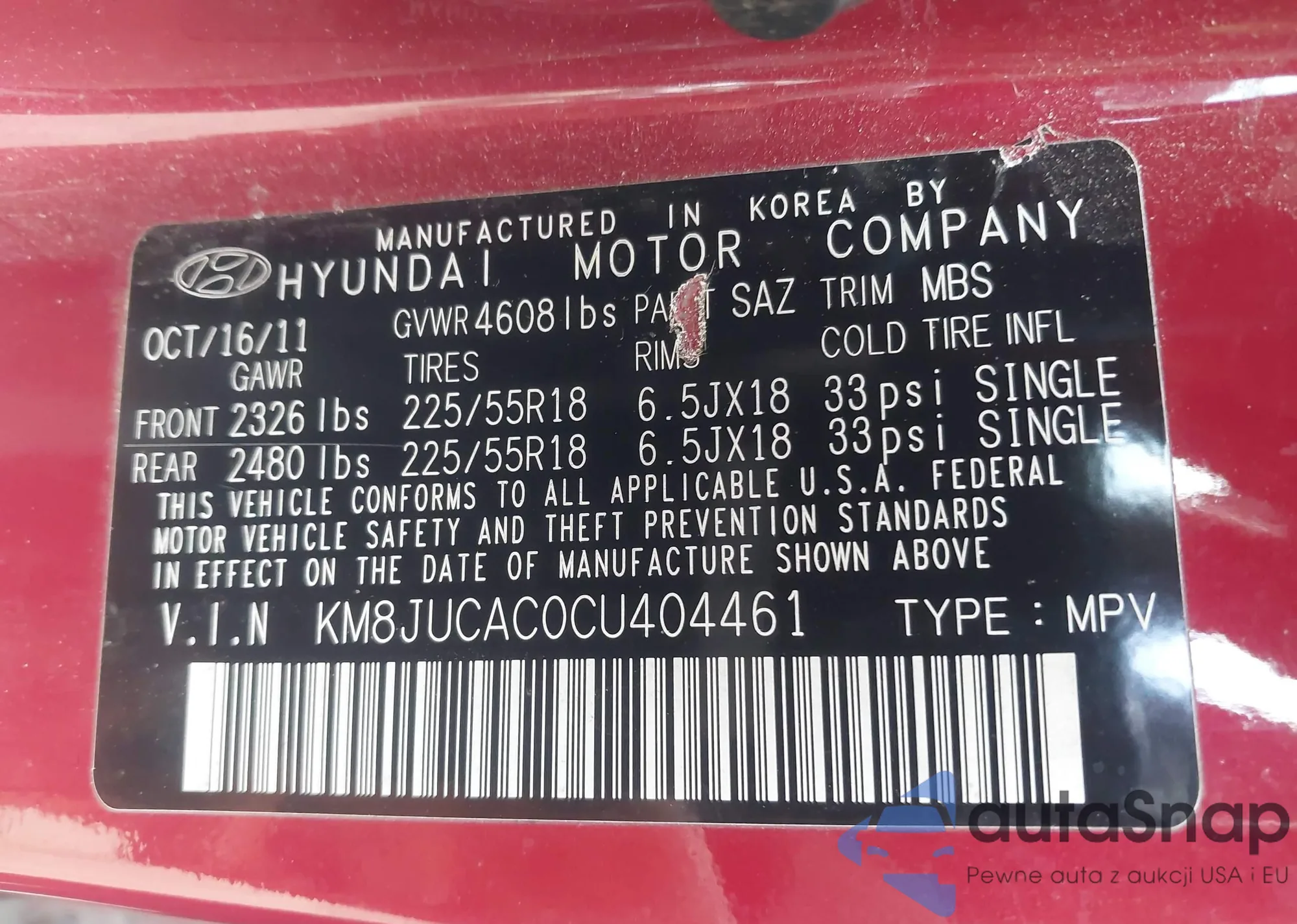 LOT: 41897972 VIN: KM8JUCAC0CU404461