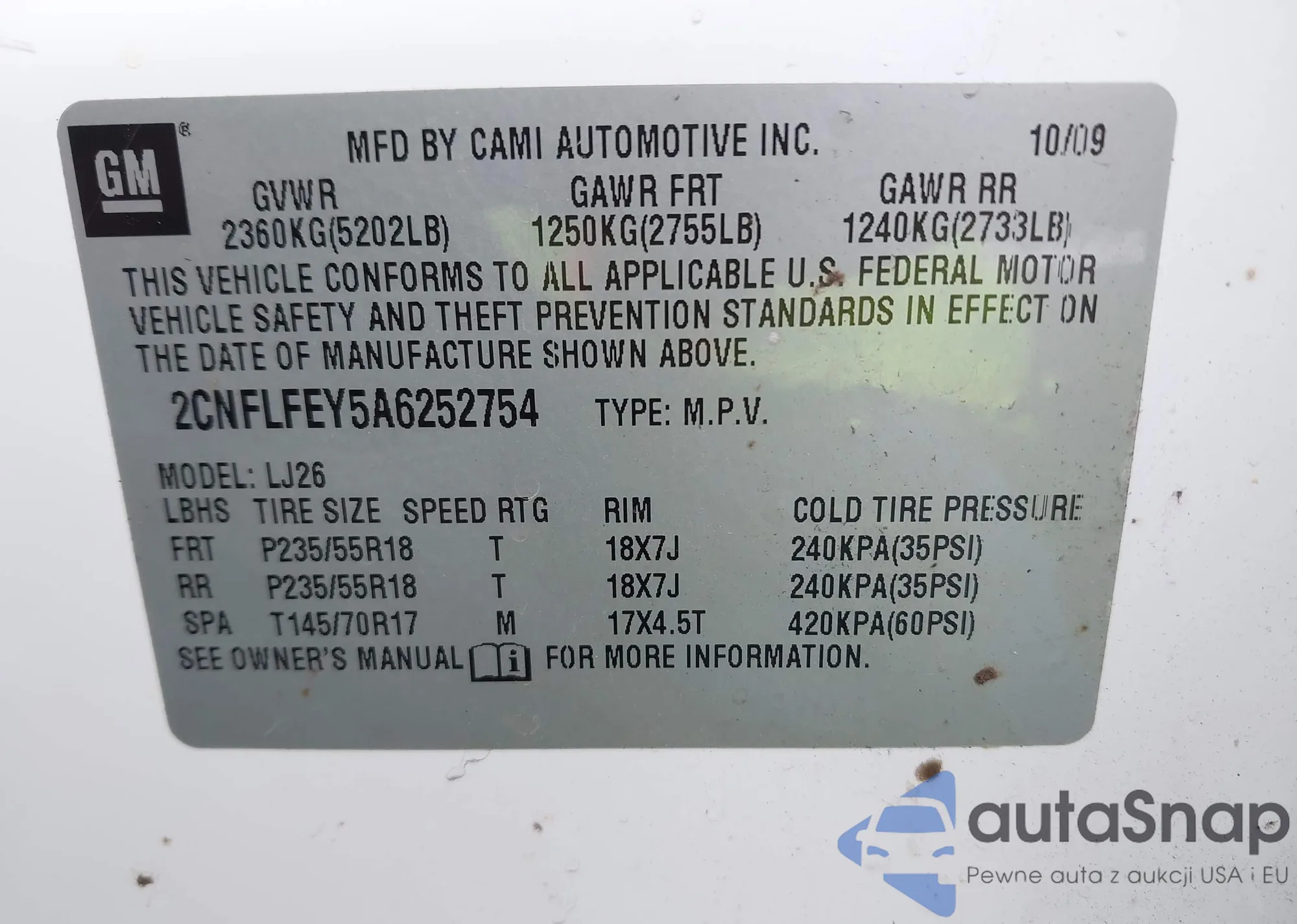 LOT: 42967800 VIN: 2CNFLFEY5A6252754
