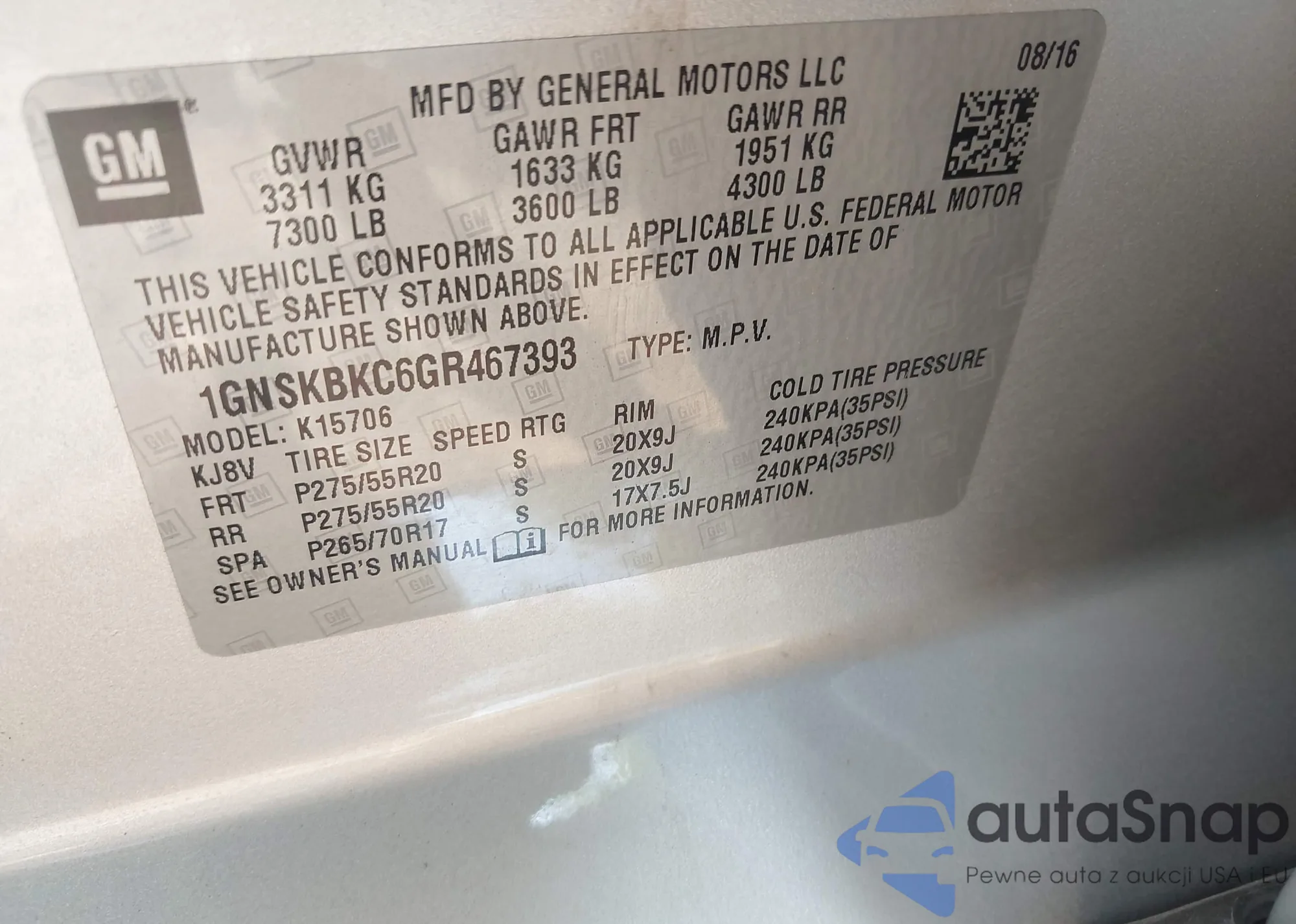 LOT: 43009662 VIN: 1GNSKBKC6GR467393