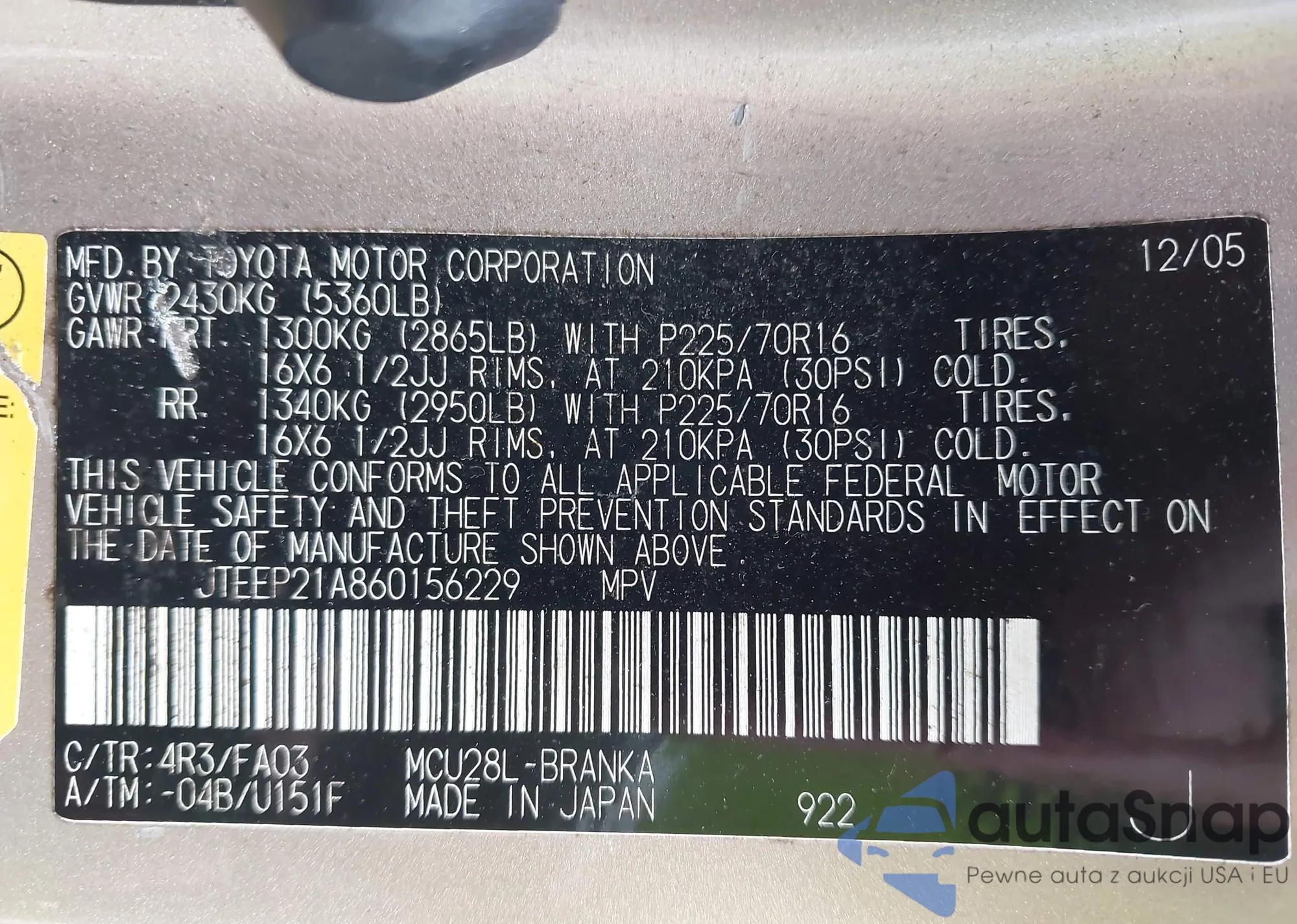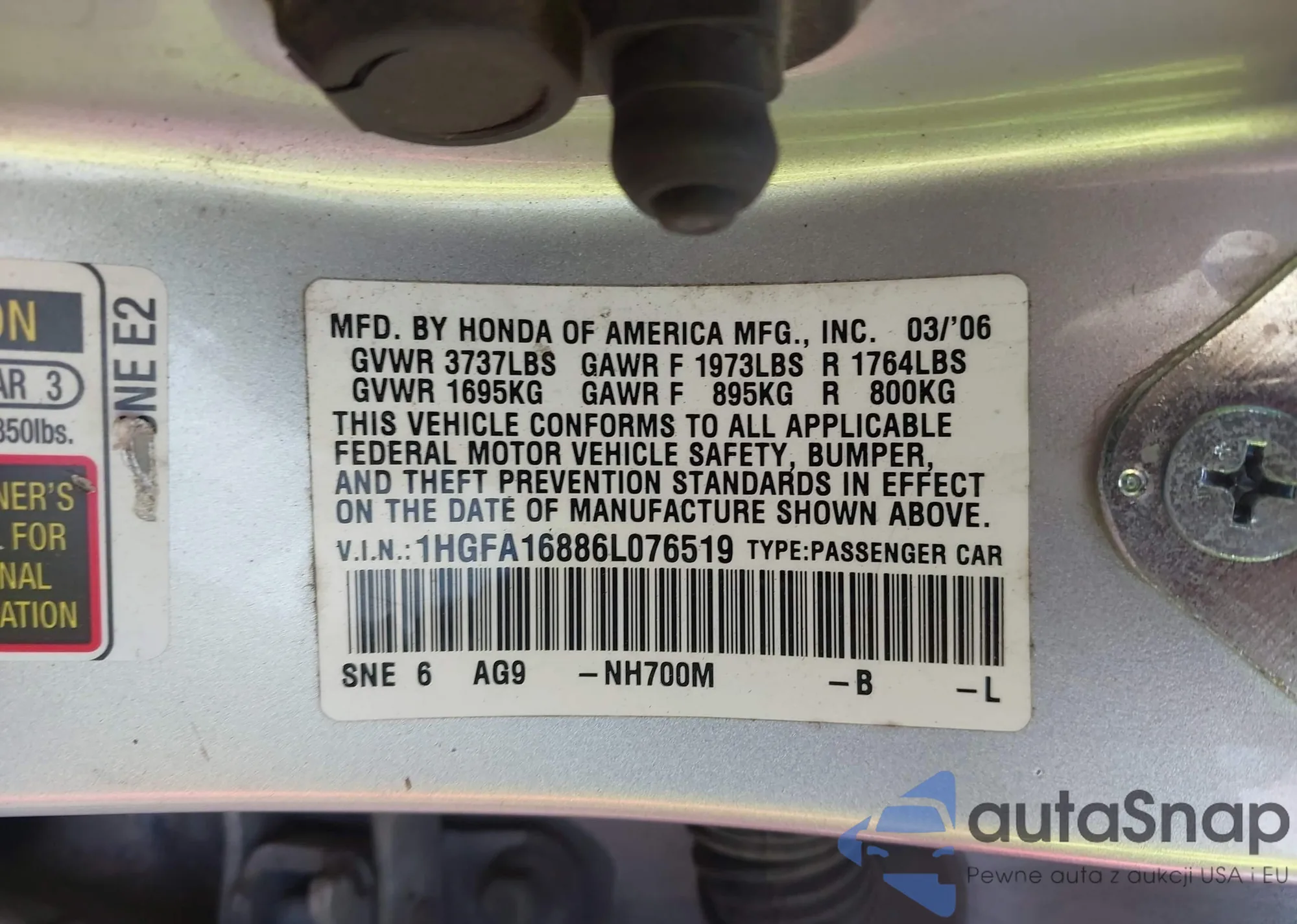 LOT: 42868486 VIN: 1HGFA16886L076519