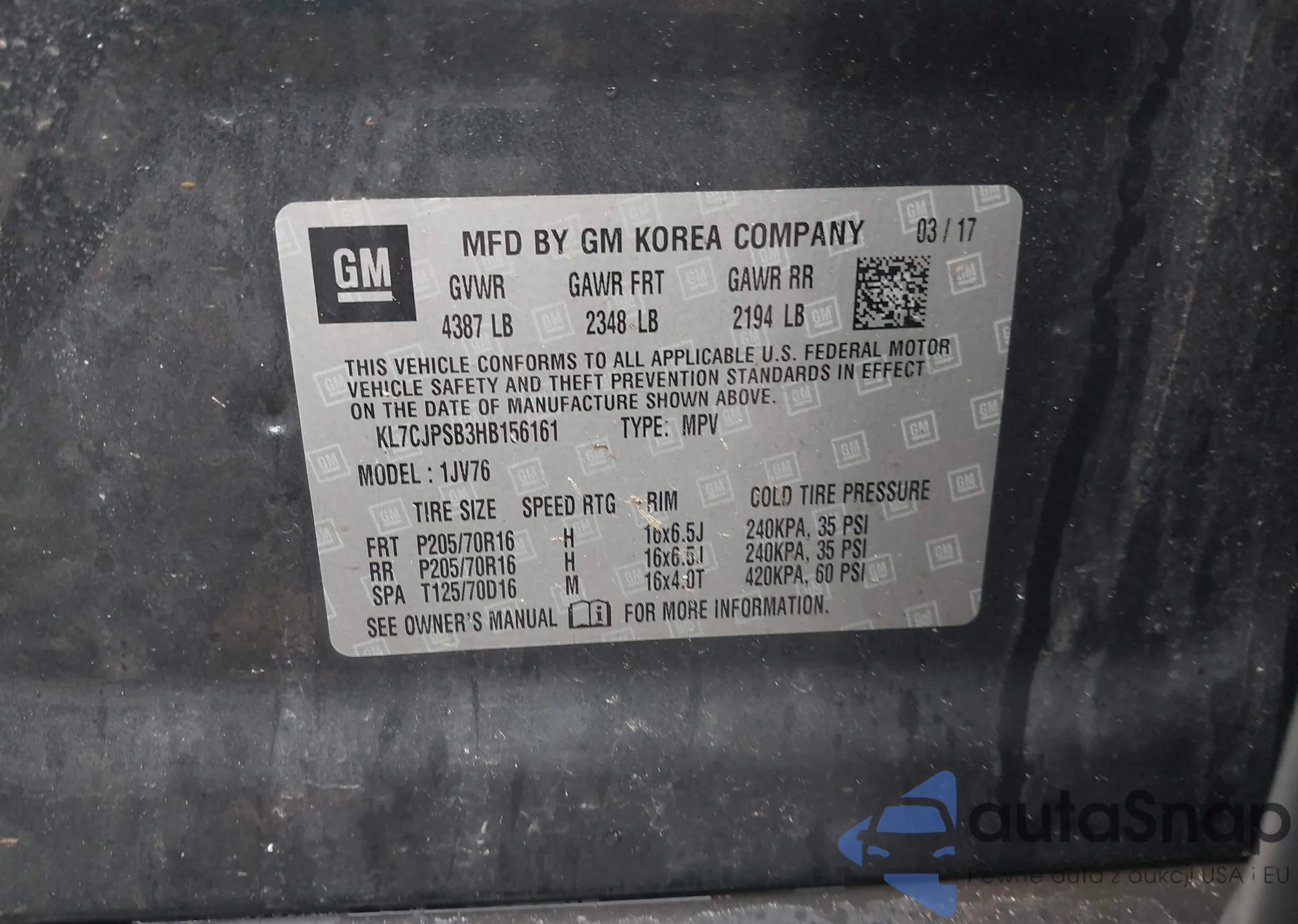 • VIN KL7CJPSB3HB156161