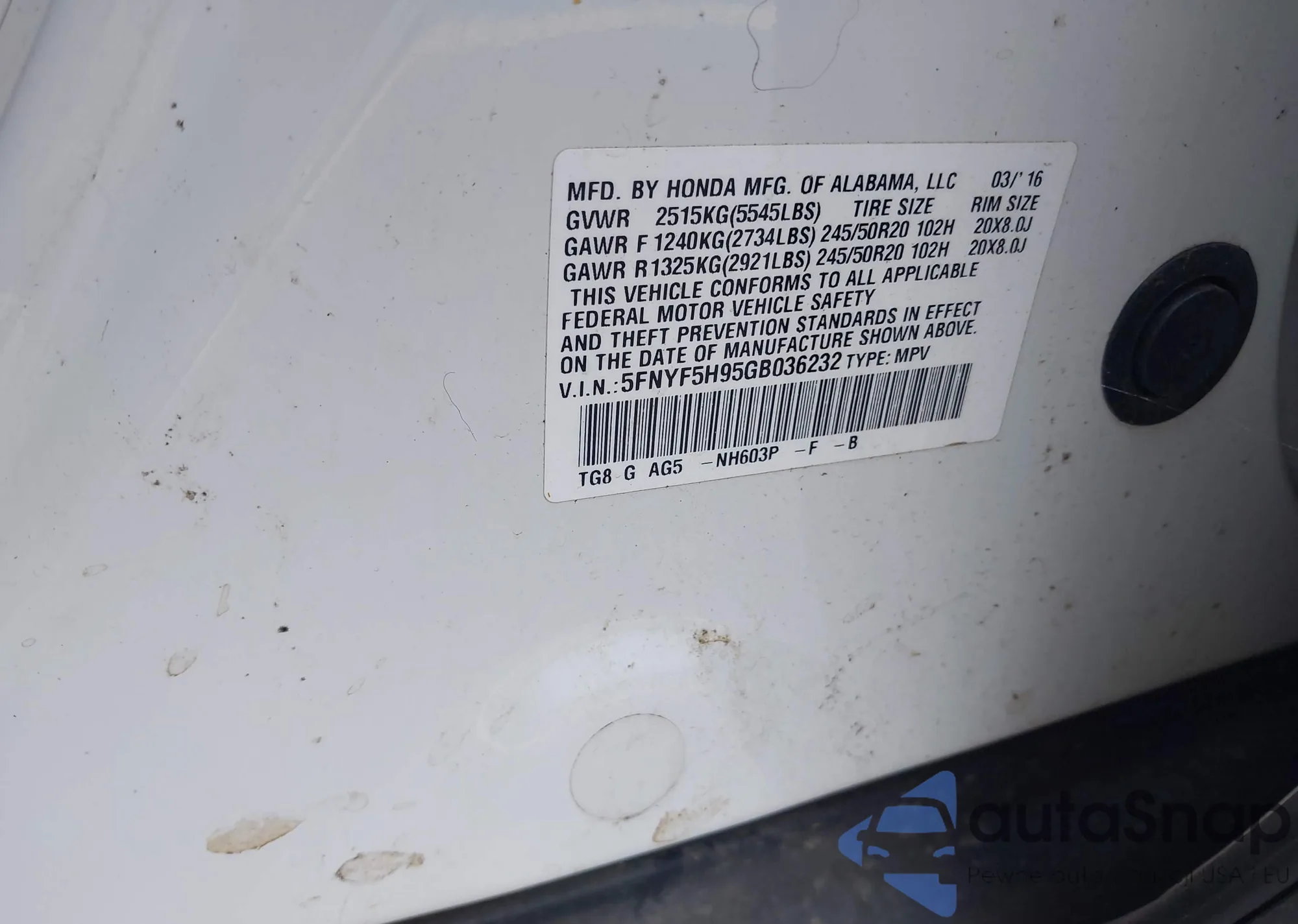 LOT: 42877186 VIN: 5FNYF4H52AB035022