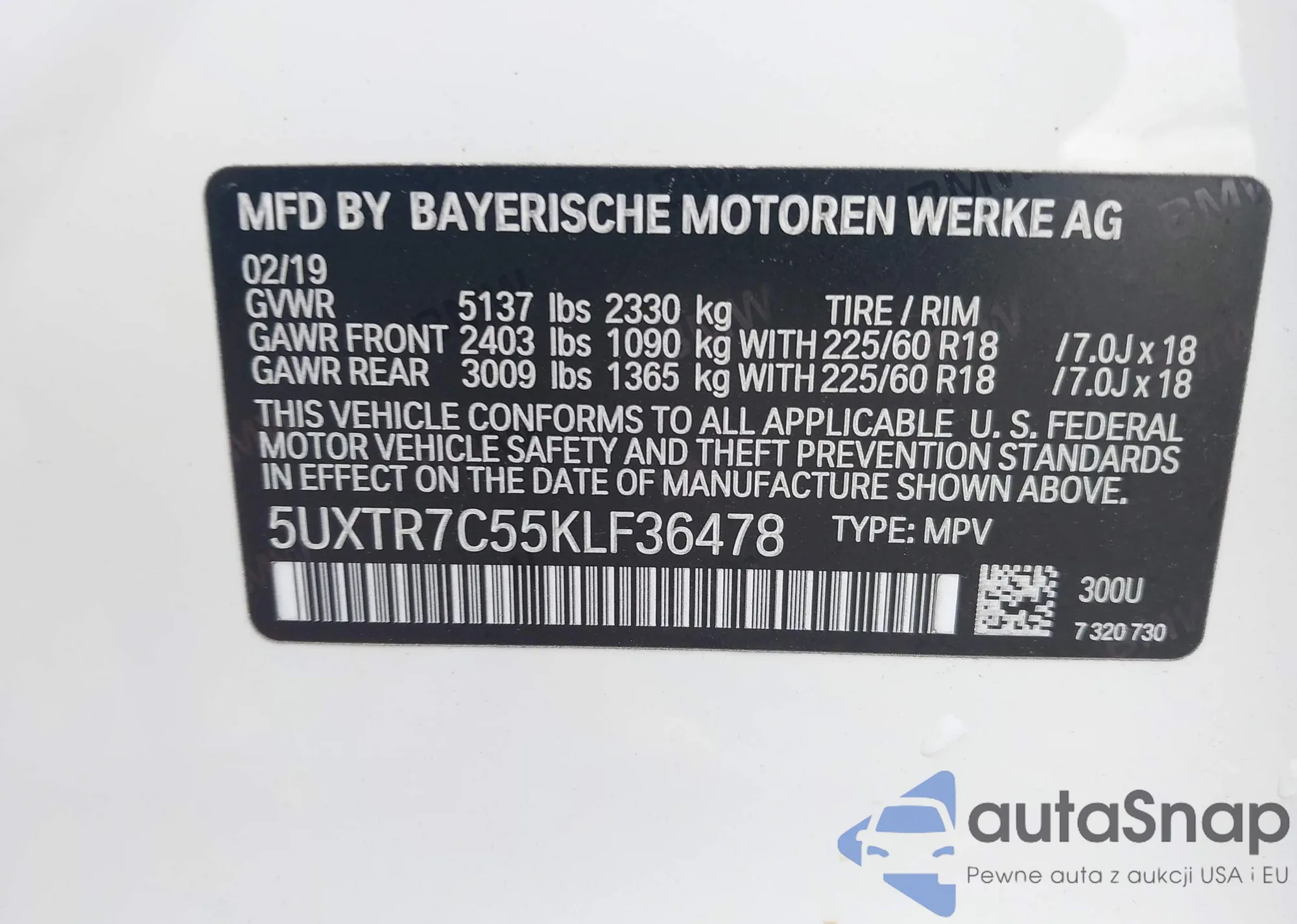 • VIN 5UXTR7C55KLF36478
