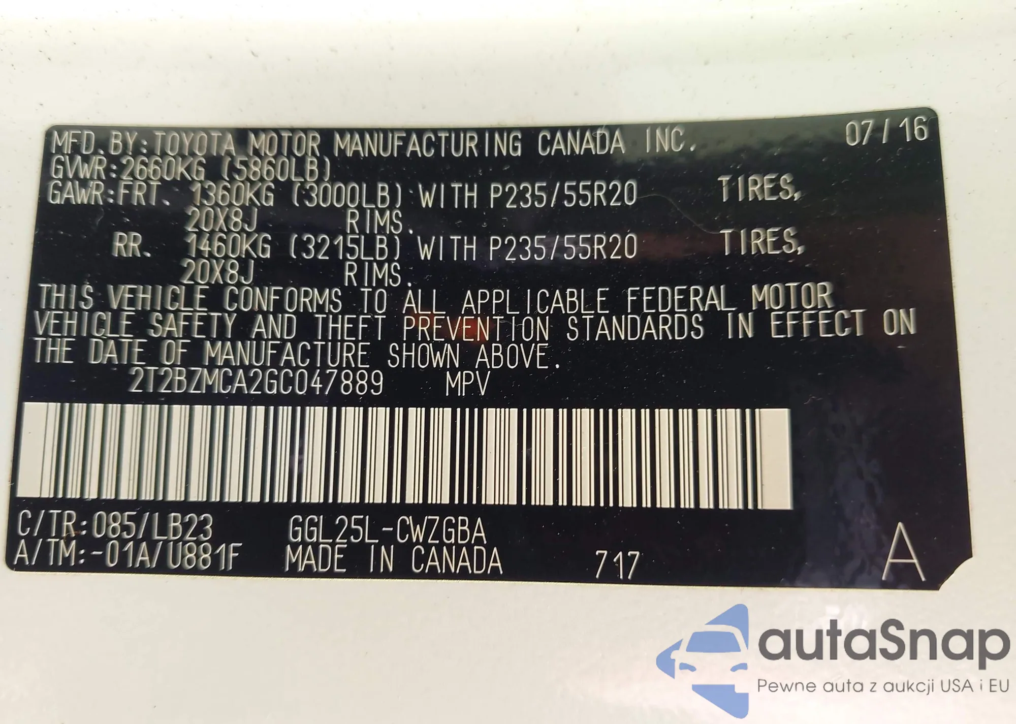 LOT: 42869316 VIN: 2T2BZMCA2GC047889
