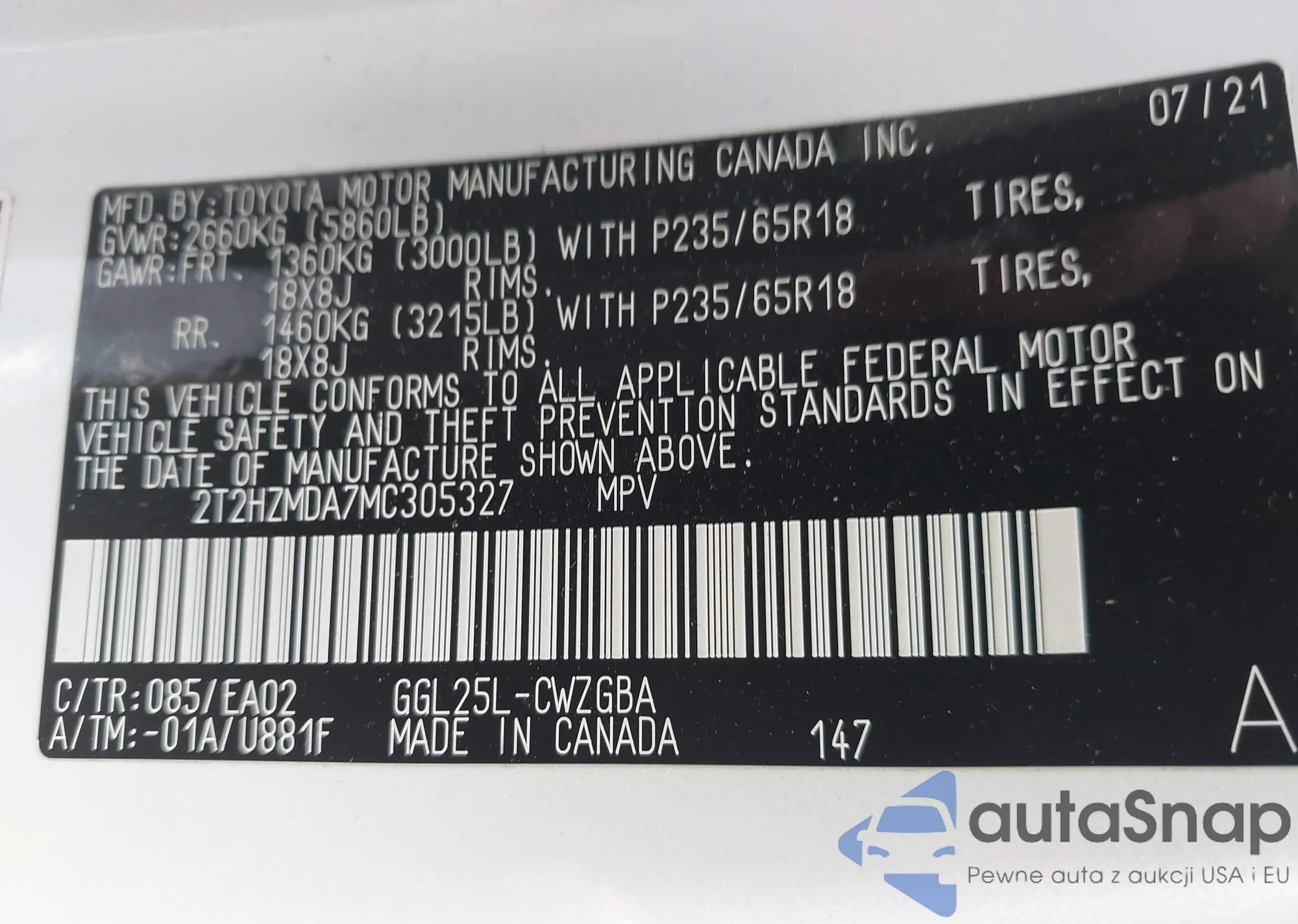 LOT: 42791930 VIN: 2T2HZMDA9MC300968