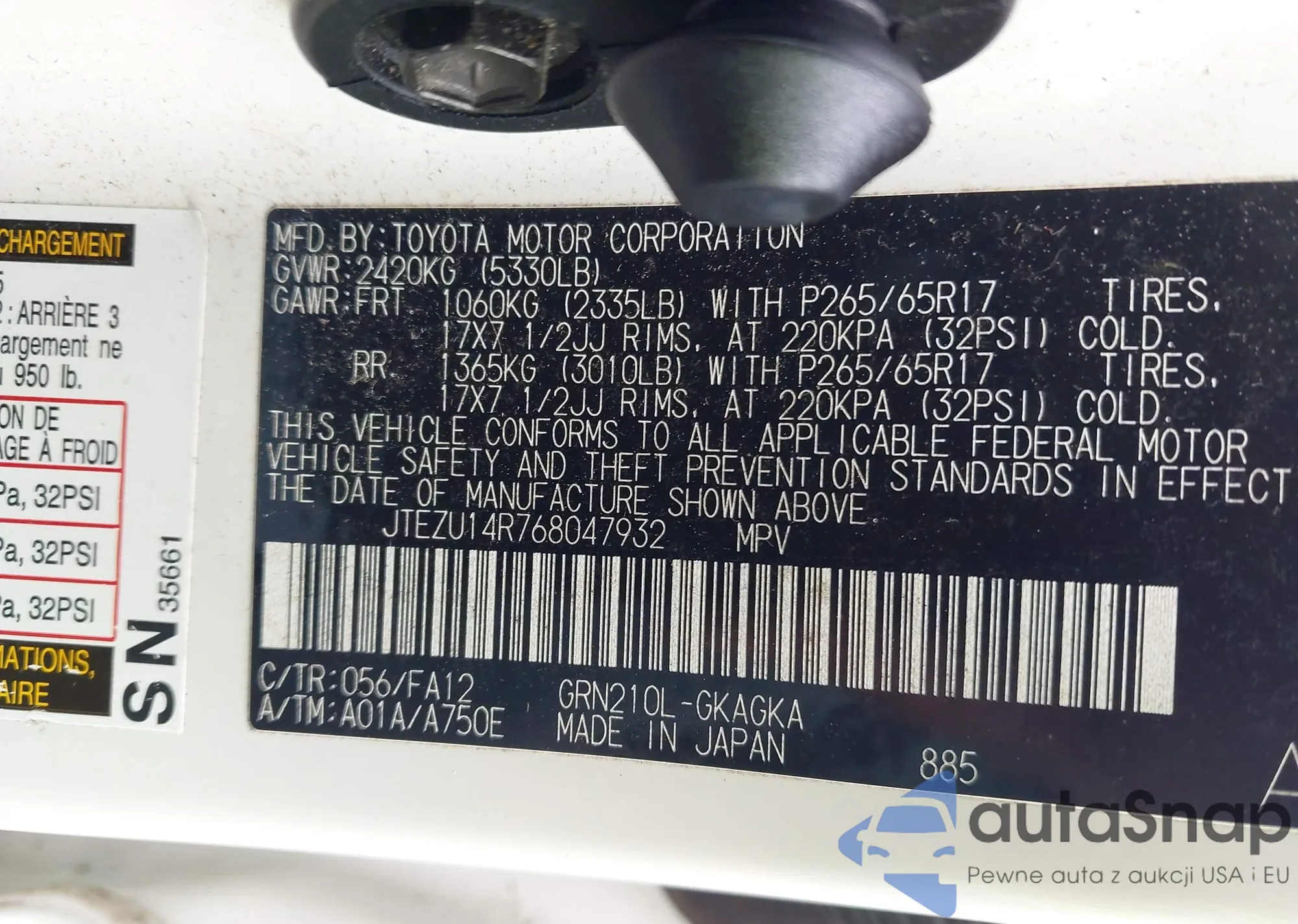 LOT: 43001839 VIN: JTEZU14R768047932