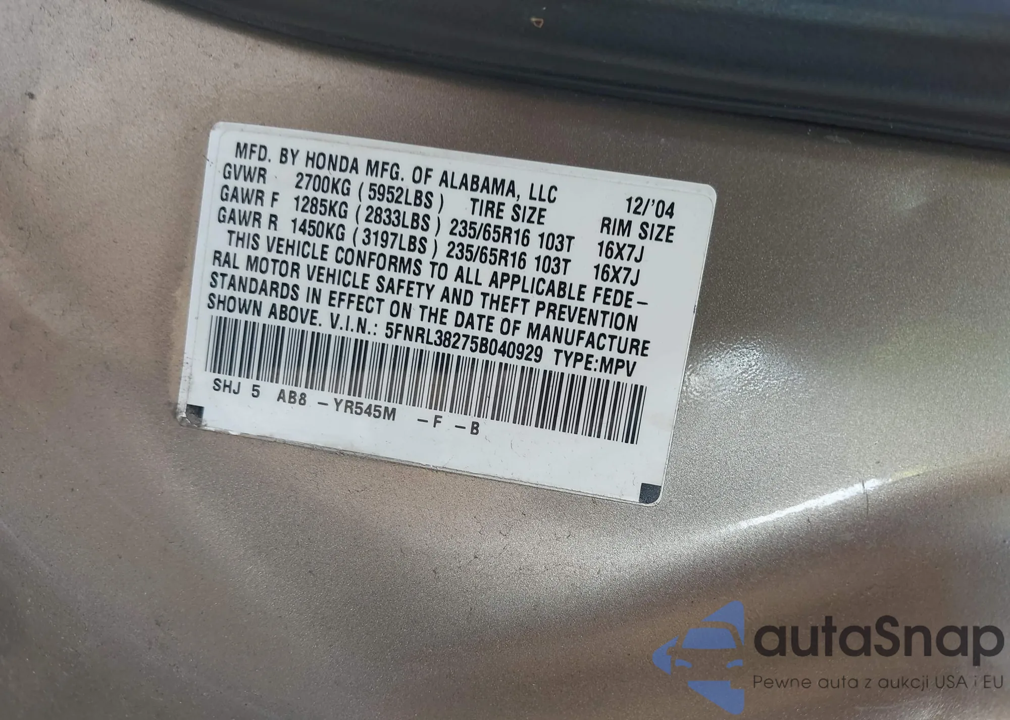 LOT: 42954319 VIN: 5FNRL38275B040929