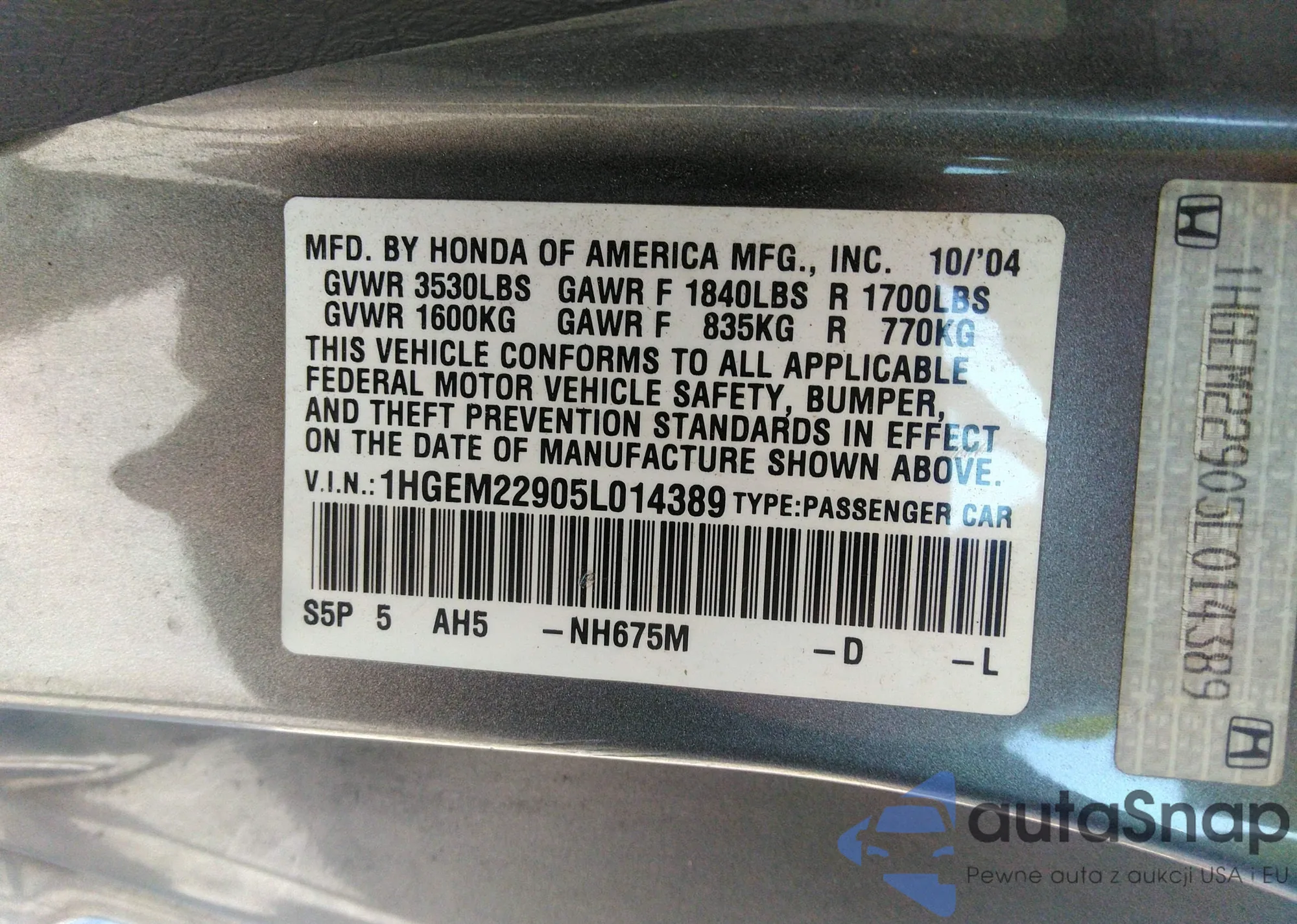 LOT: 42854535 VIN: 1HGEM22905L014389