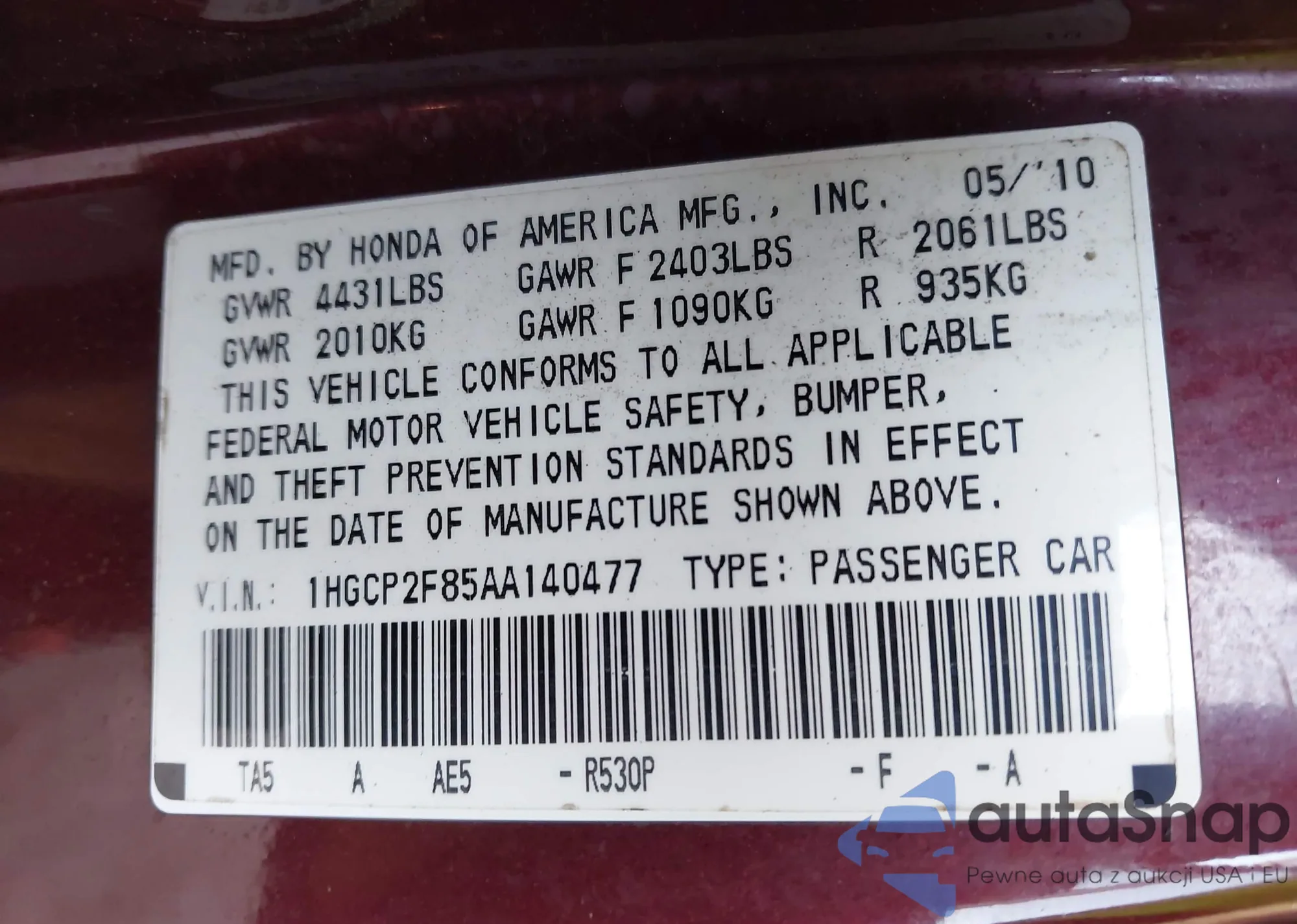 LOT: 42930289 VIN: 1HGCP2F85AA140477