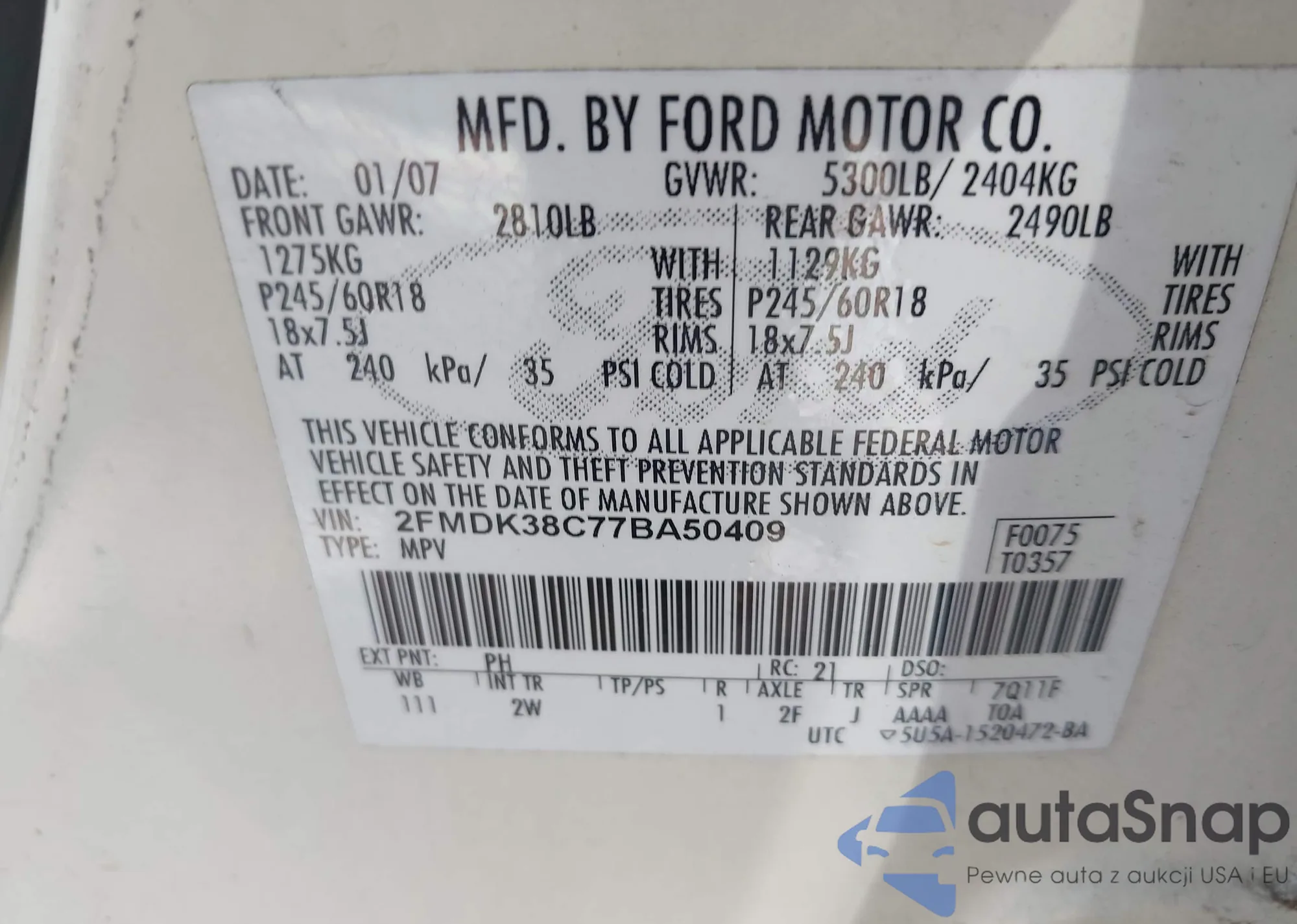LOT: 42876521 VIN: 2FMDK38C77BA50409