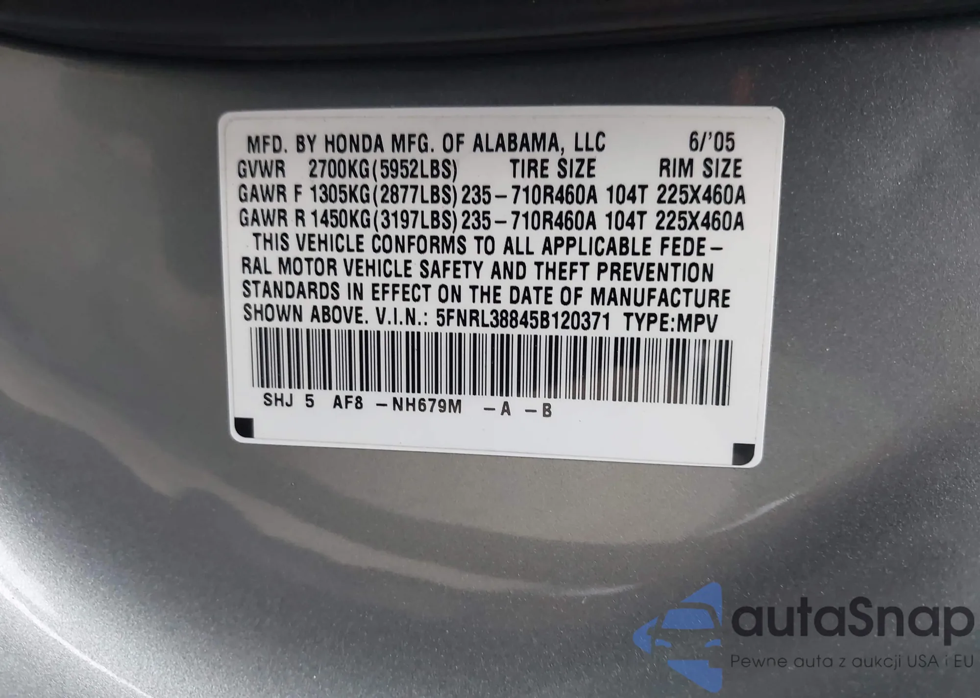 • VIN 5FNRL38845B120371