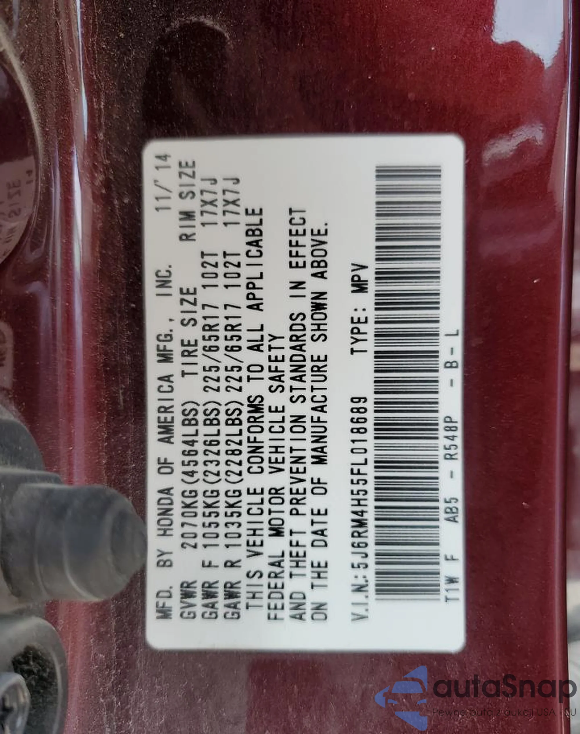 • VIN 5J6RM4H55FL018689