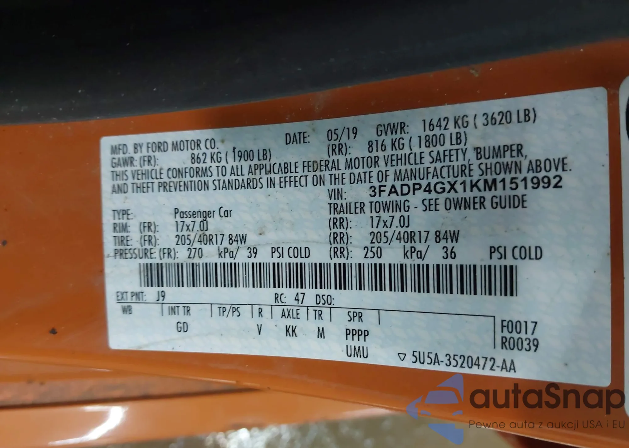 LOT: 42800909 VIN: 1FMCU0F78KUA39545