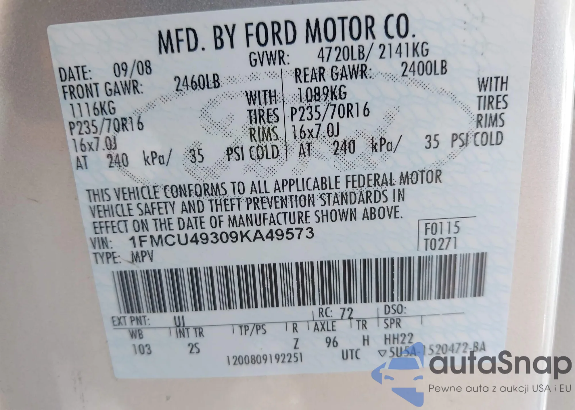 LOT: 43052730 VIN: 1FMCU49309KA49573