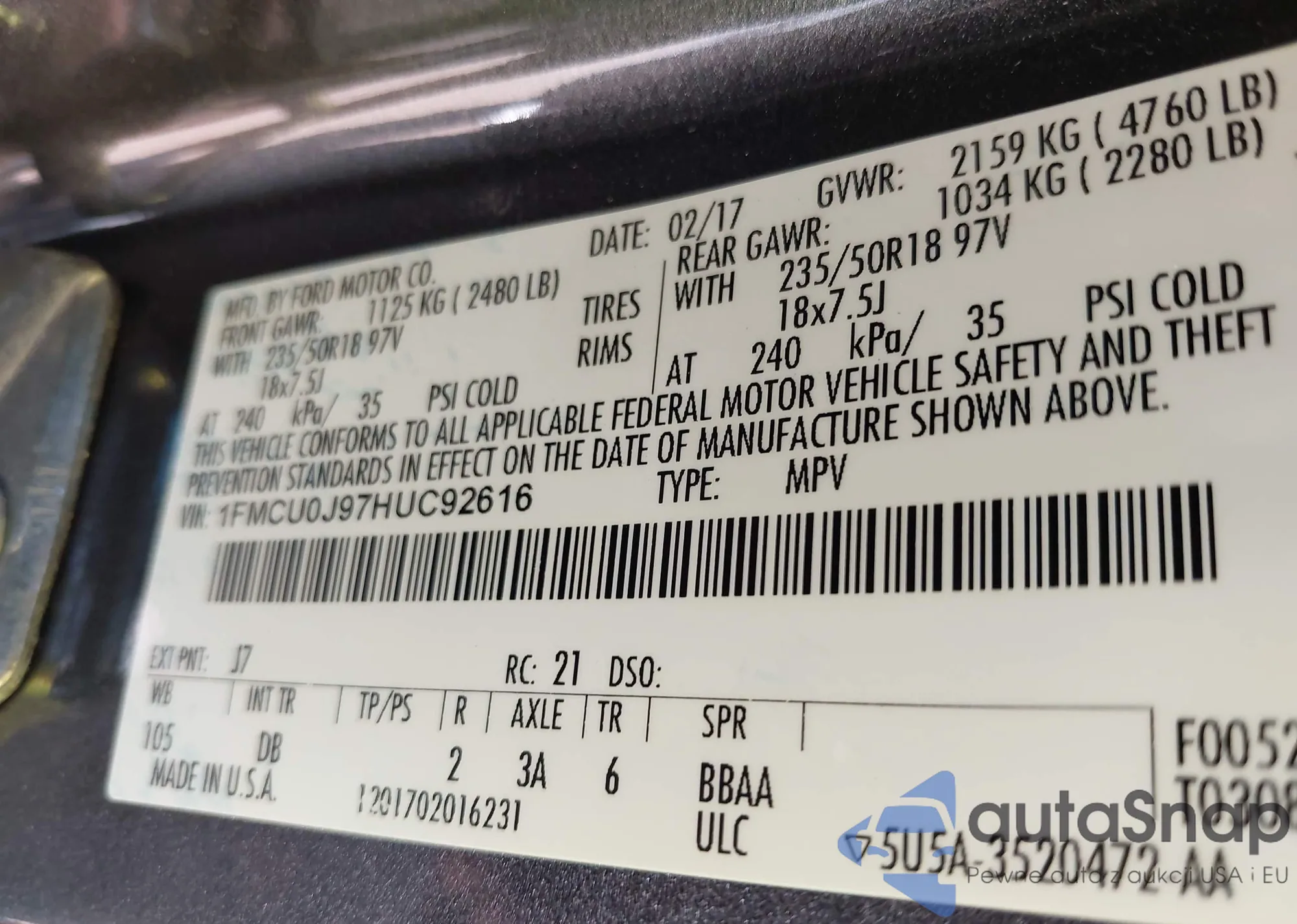 • VIN 1FMCU0J97HUC92616