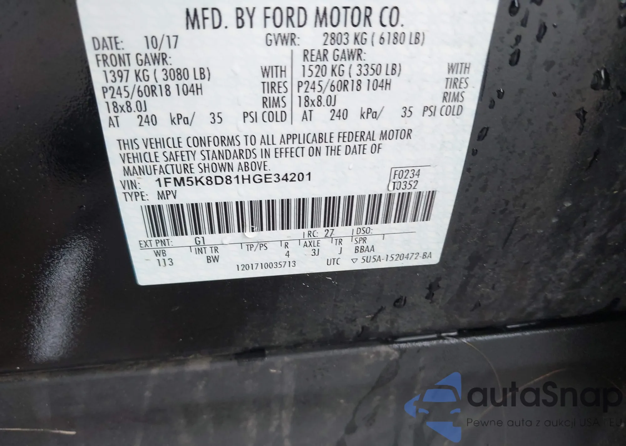 • VIN 1FMCU9HX8DUC63242