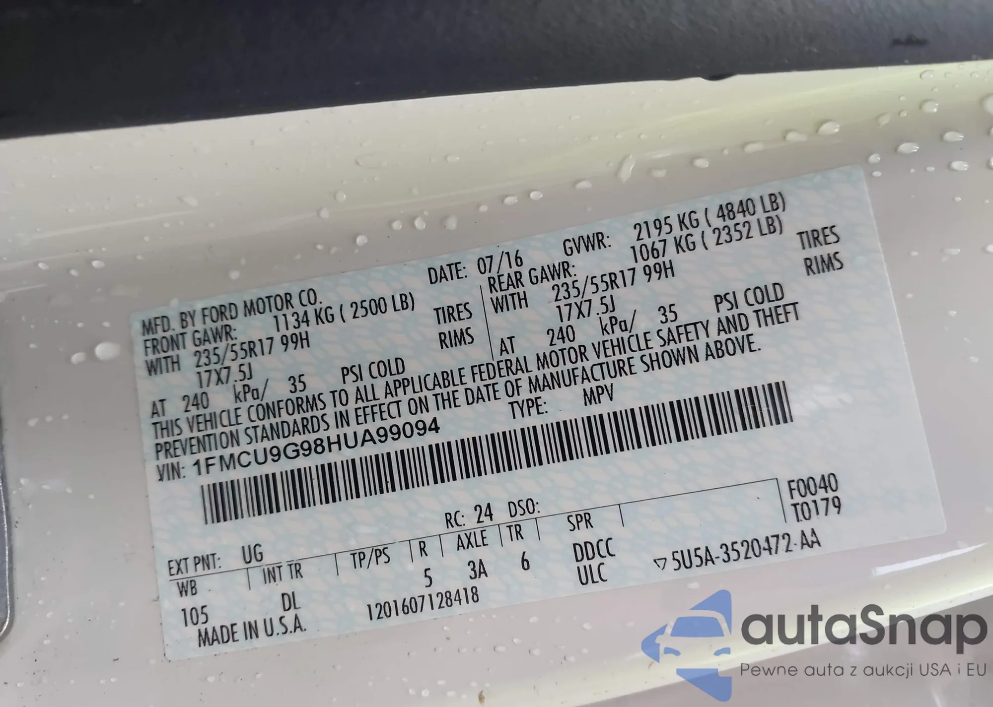 • VIN 1FMCU9G98HUA99094