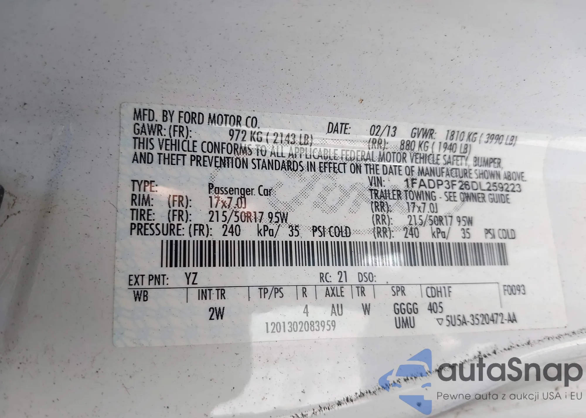 LOT: 42973869 VIN: 1FADP3F26DL259223