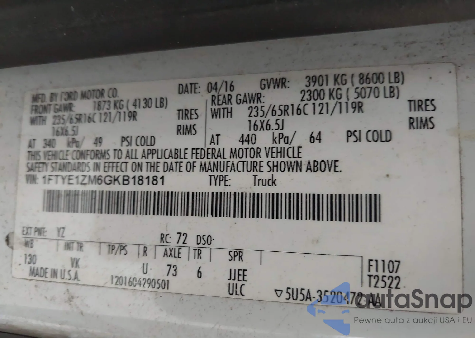 LOT: 42951399 VIN: 1FTYE1ZM6GKB18181