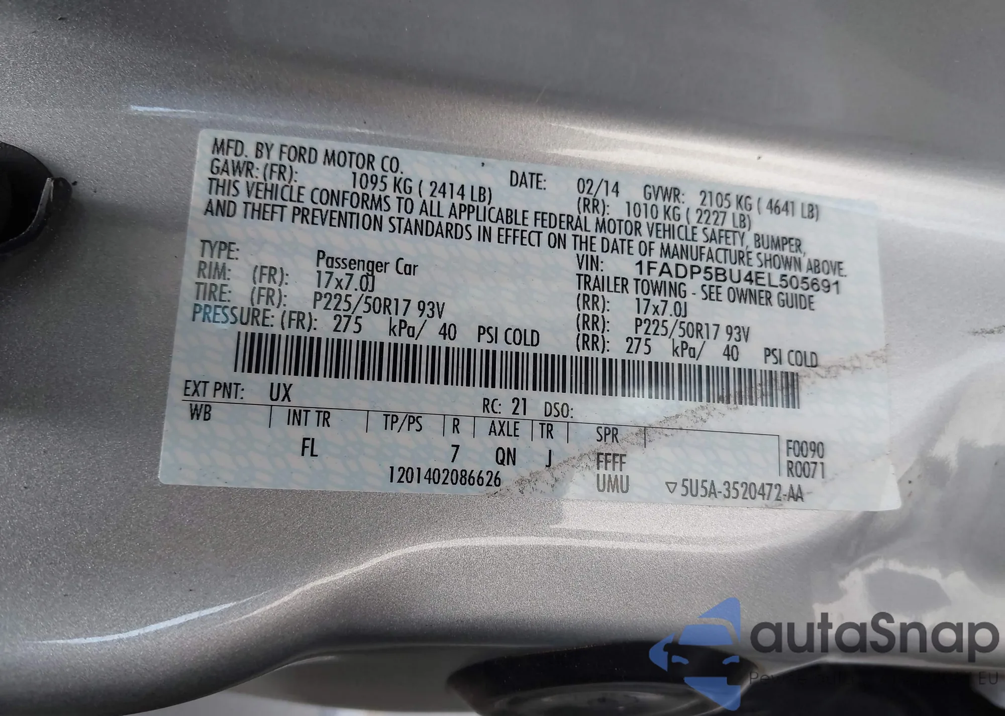 • VIN 1FADP5BU4EL505691
