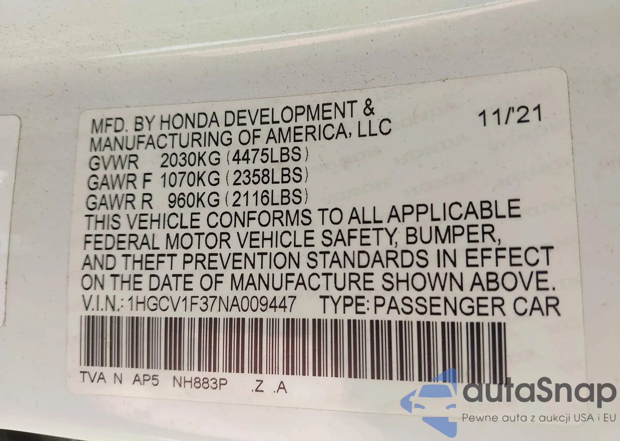 LOT: 42802497 VIN: 1HGCV1F37NA009447