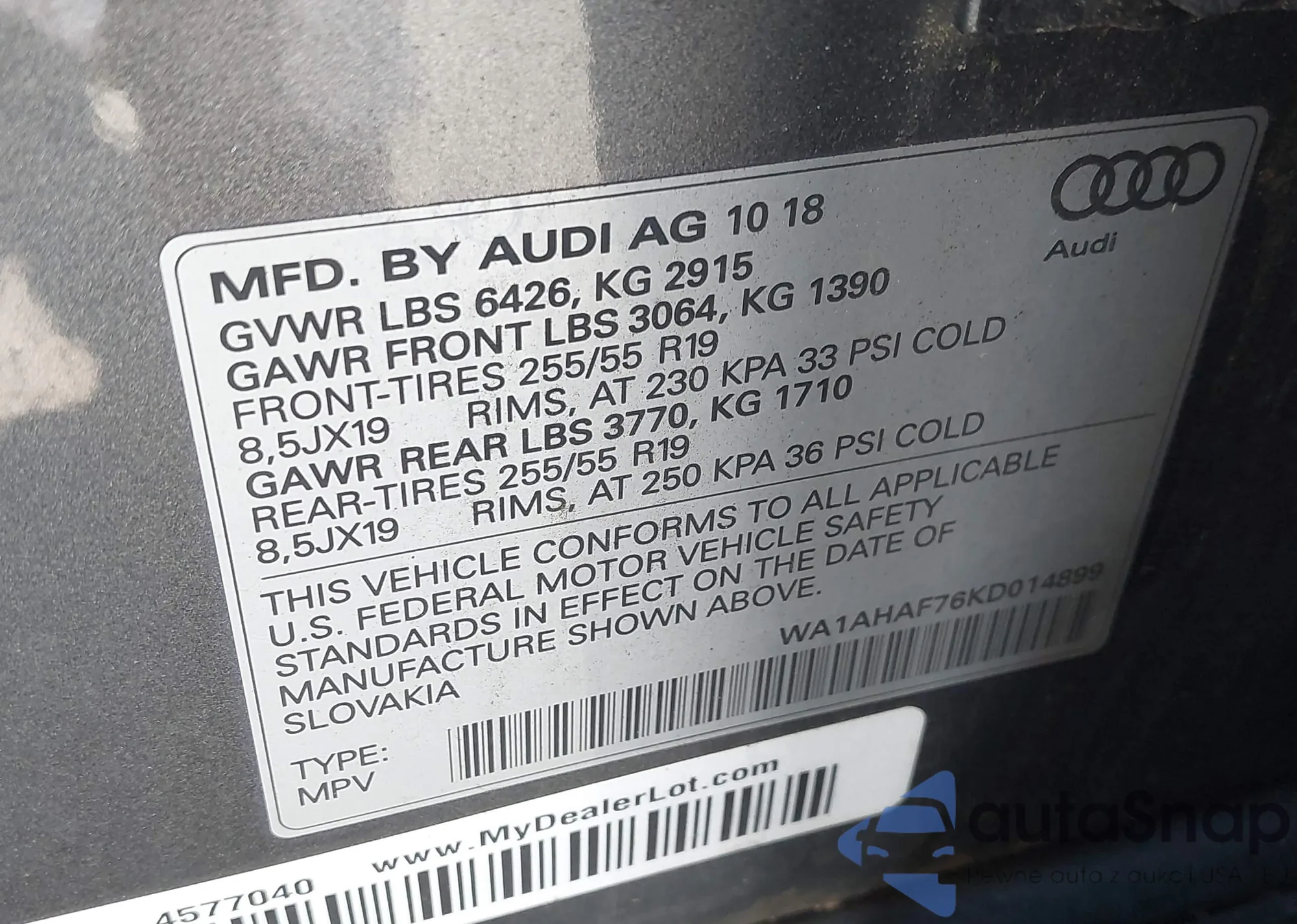 LOT: 42991833 VIN: WA1AHAF76KD014899