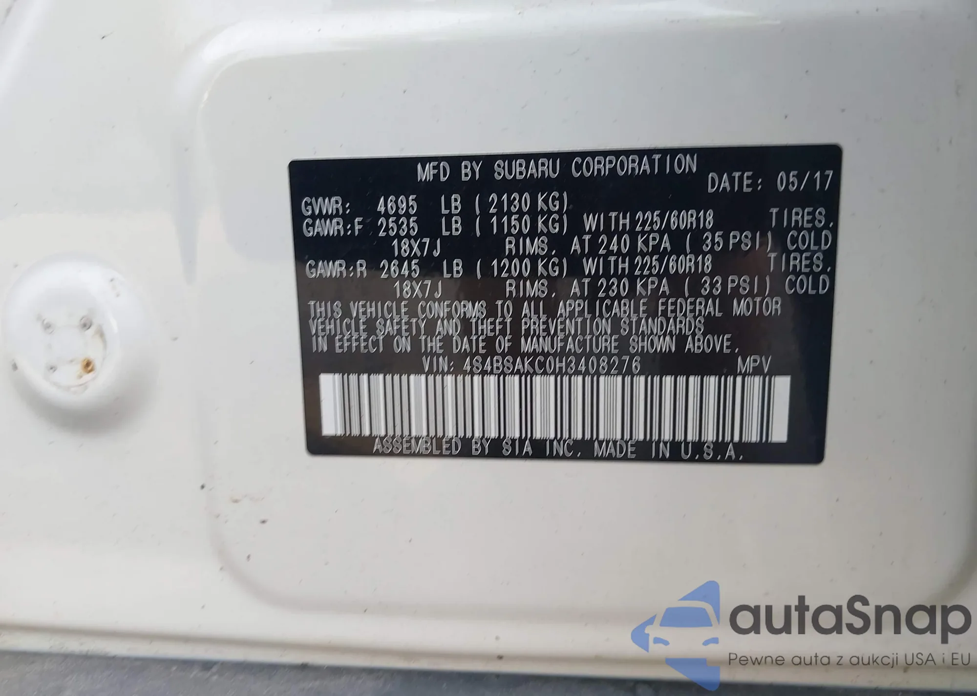 LOT: 42915339 VIN: 4S4BSAKC0H3408276