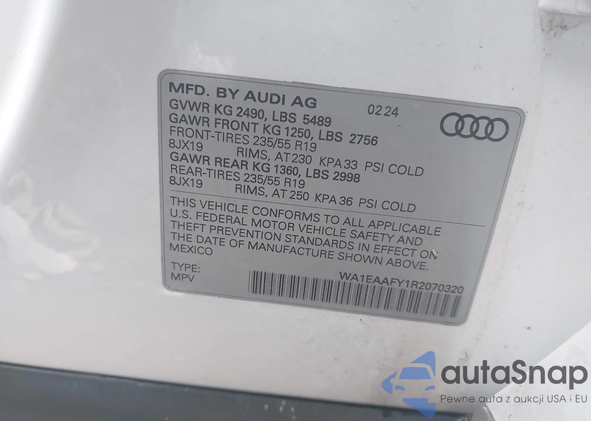 LOT: 43050222 VIN: WAUHFAFL3EA089487