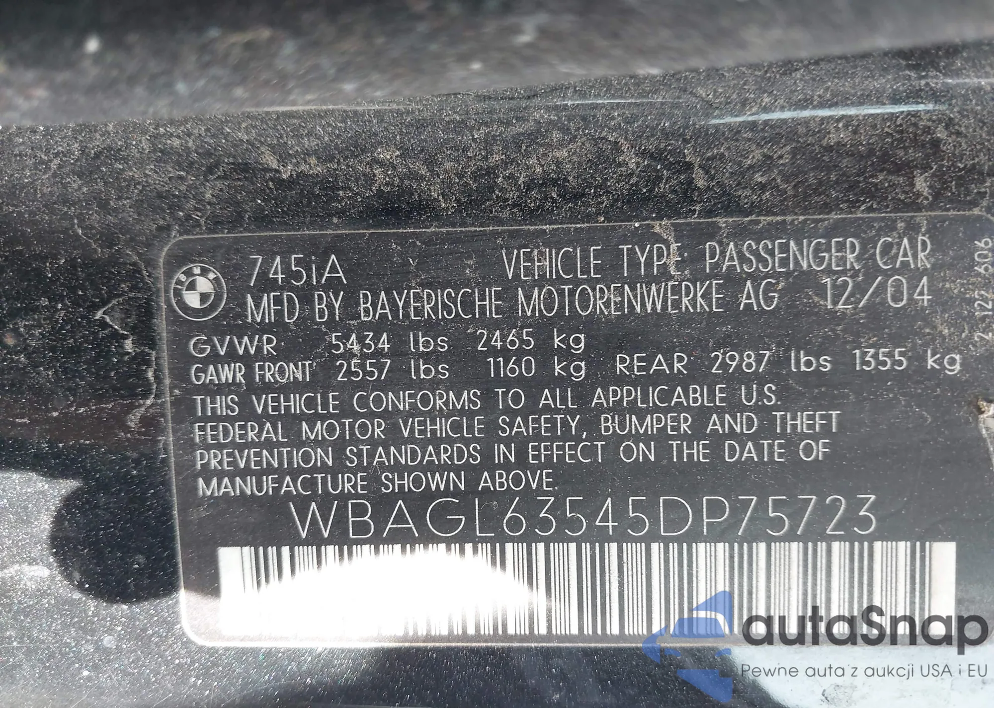 • VIN WBAGL63545DP75723