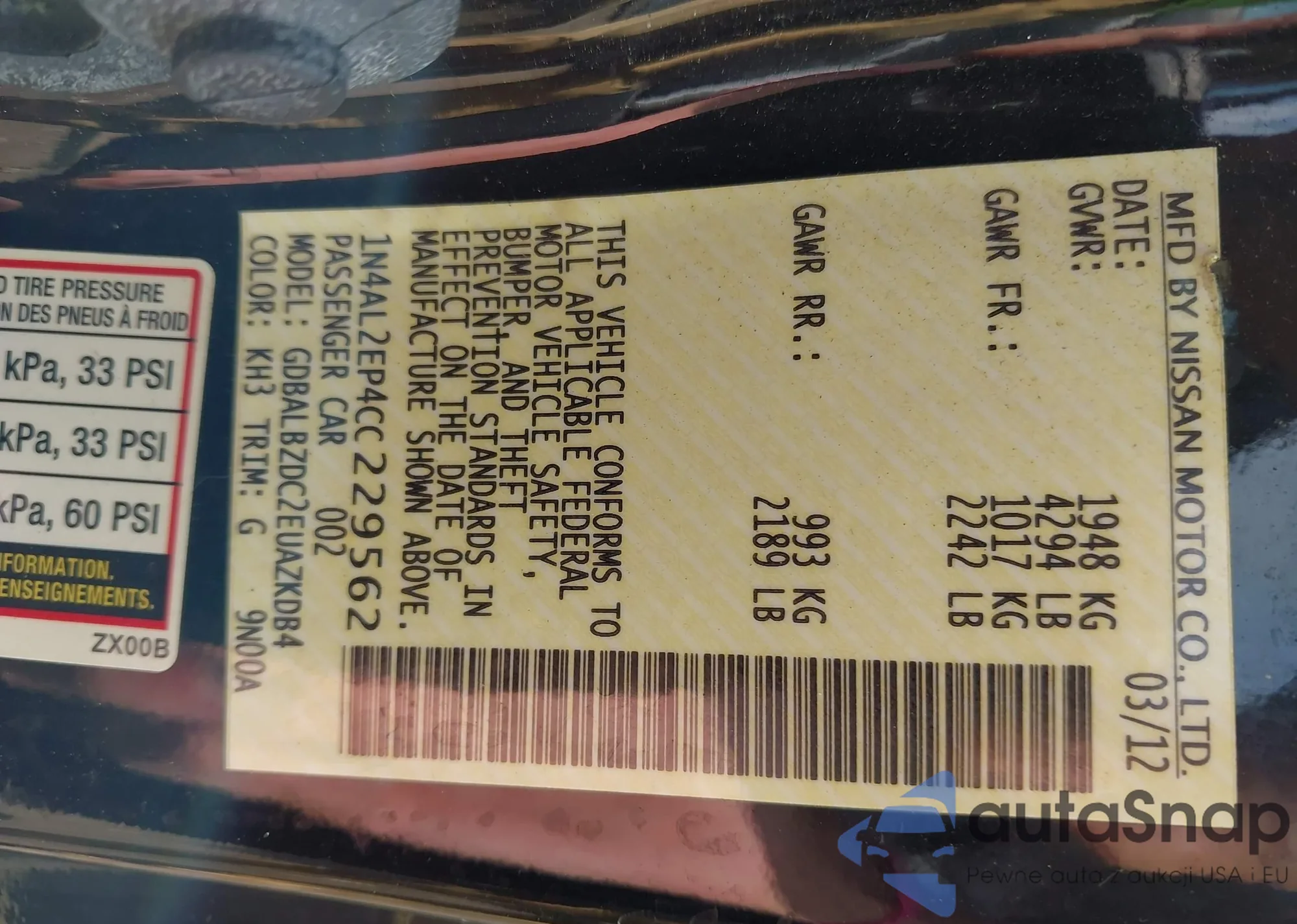 LOT: 42833876 VIN: 1N4AL2EP4CC229562