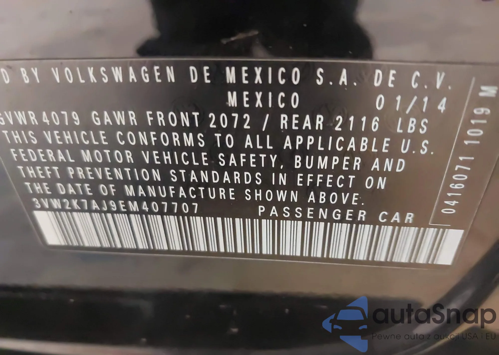 • VIN 3VW2K7AJ9EM407707