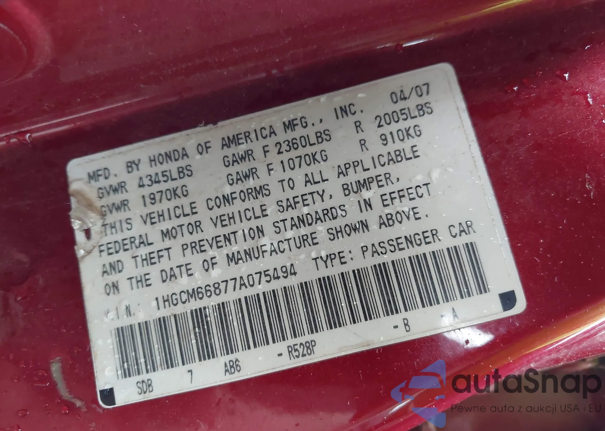 LOT: 42912723 VIN: 1HGCM66877A075494