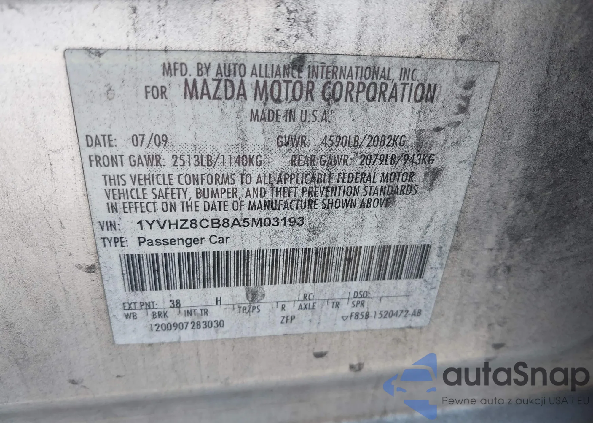 • VIN 1YVHZ8CB8A5M03193