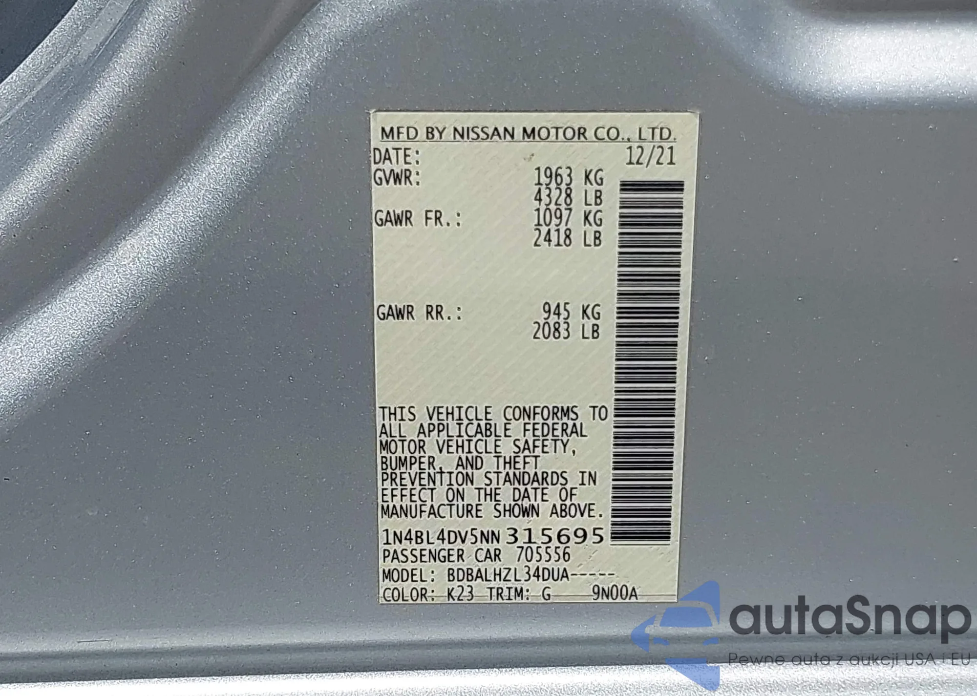 LOT: 43030661 VIN: 1N4BL4DV5NN315695