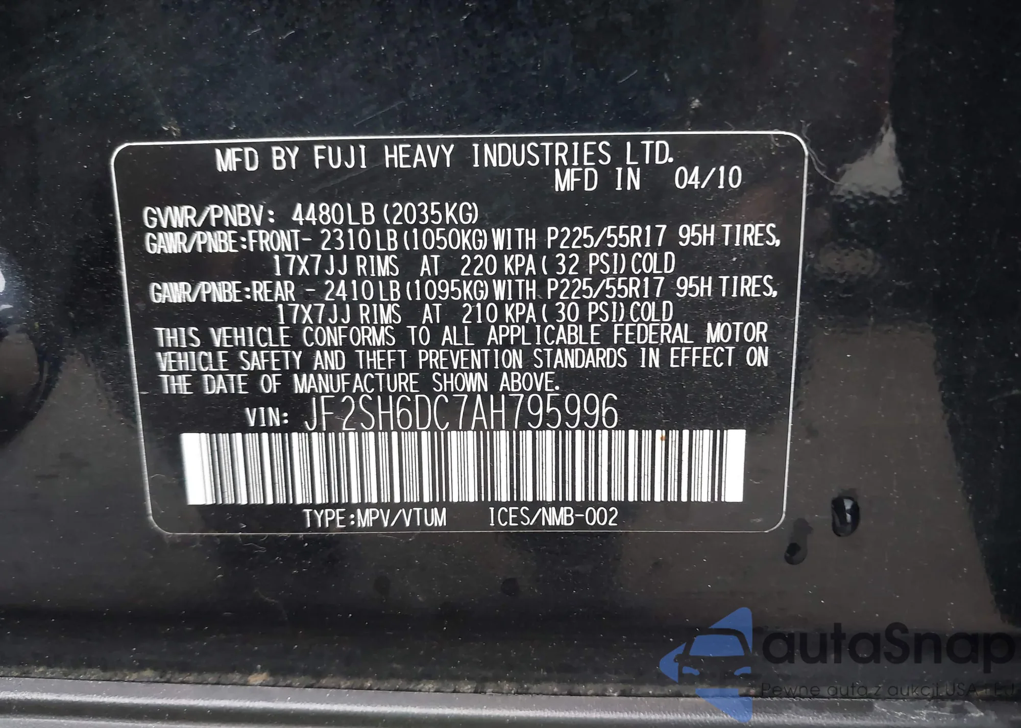 • VIN JF2SH6DC7AH795996