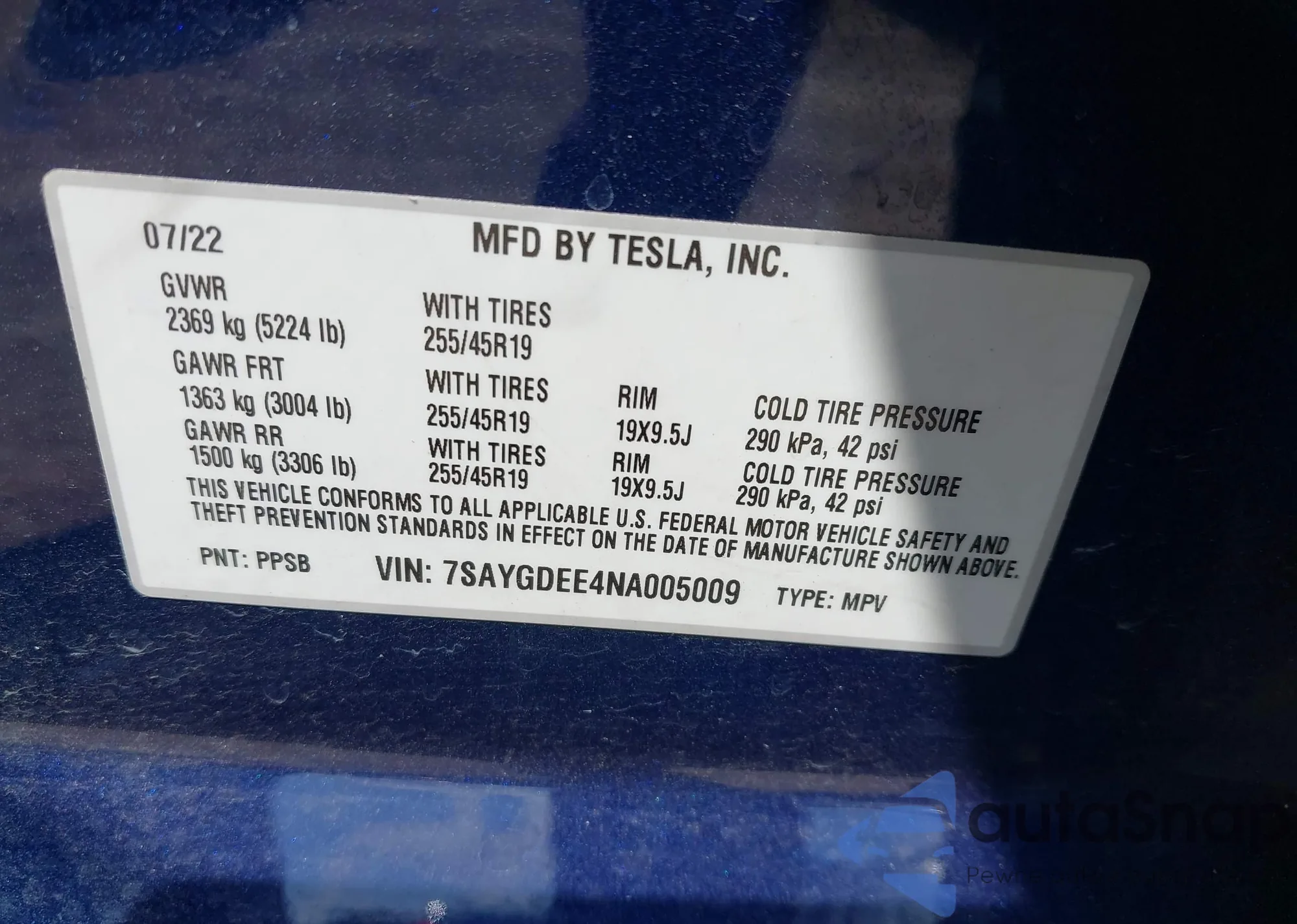 • VIN 5YJ3E1EA9PF559029