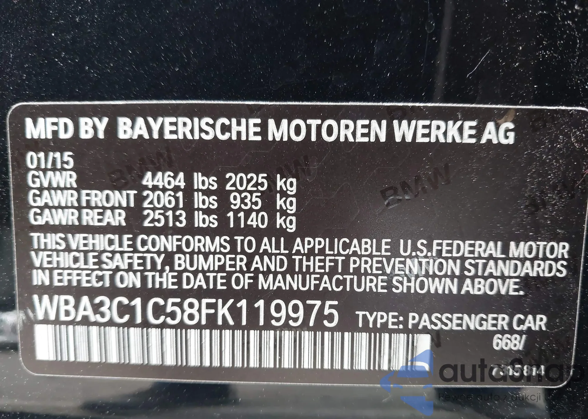 LOT: 42843545 VIN: WBA3C1C58FK119975