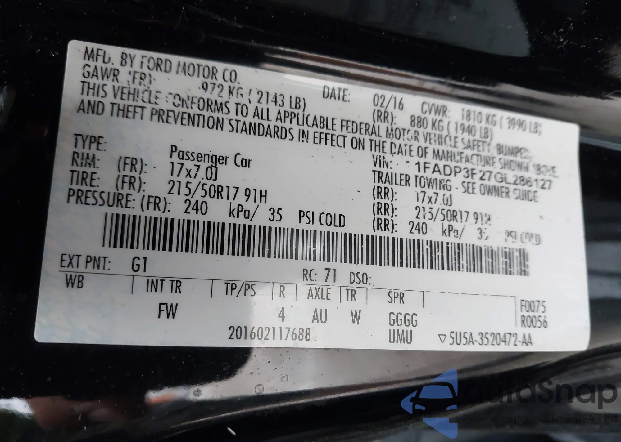 LOT: 42658737 VIN: 1FADP3F27GL286127