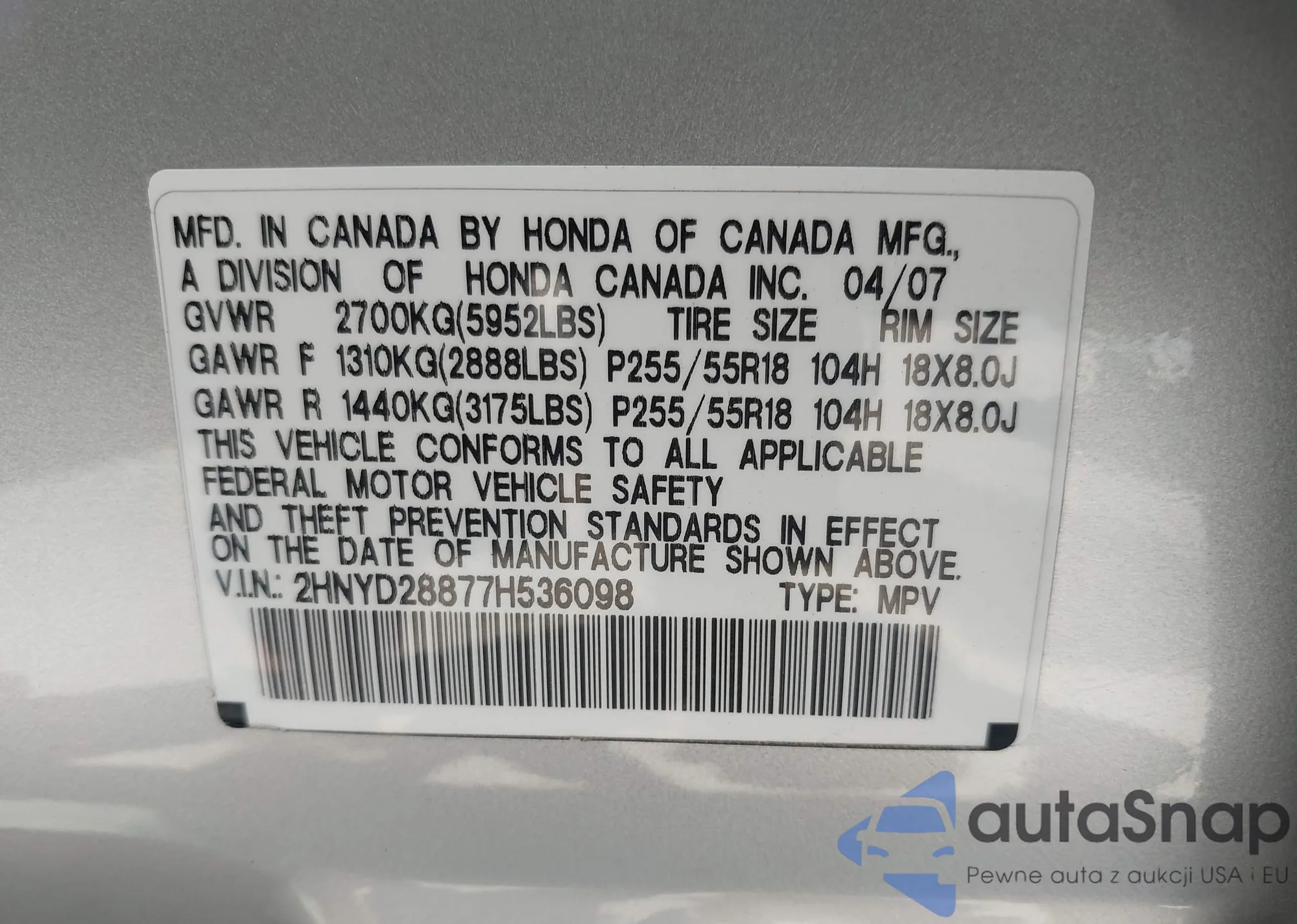 LOT: 43001954 VIN: 2HNYD28877H536098