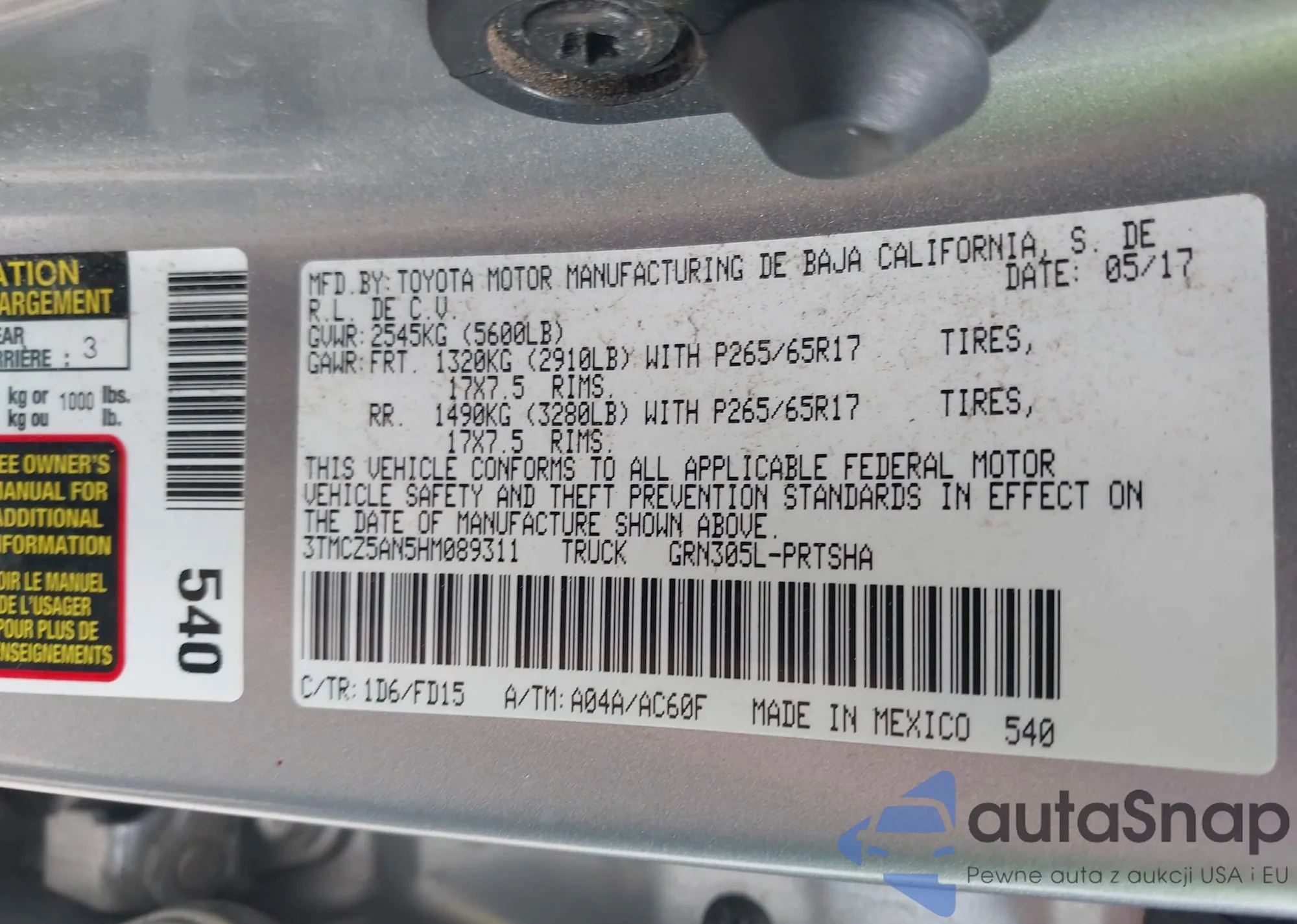 • VIN 3TMCZ5AN5HM089311