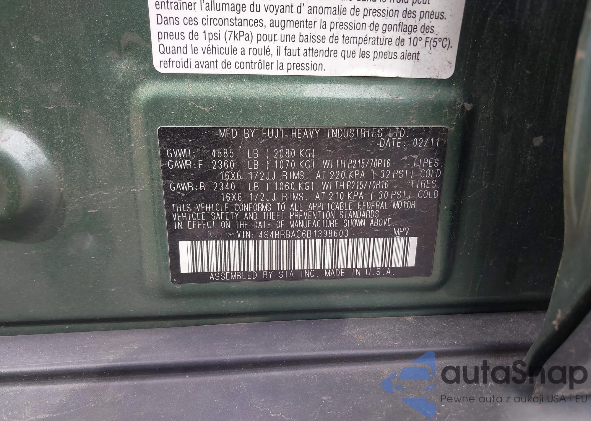 • VIN 4S4BRBAC6B1398603