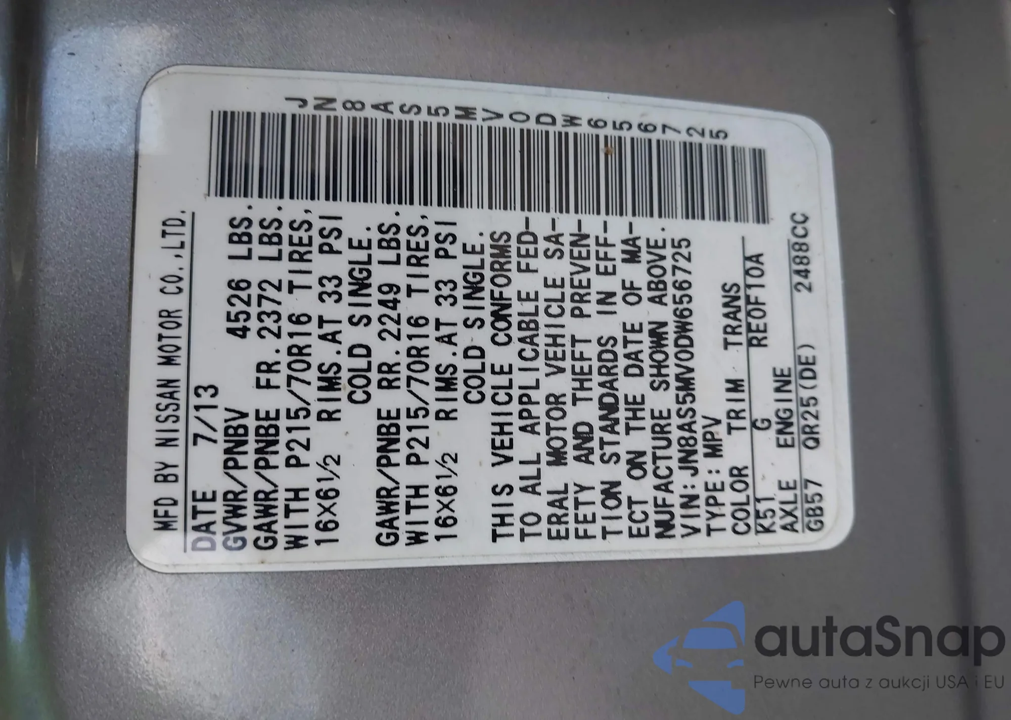 • VIN JN8AS5MV0DW656725