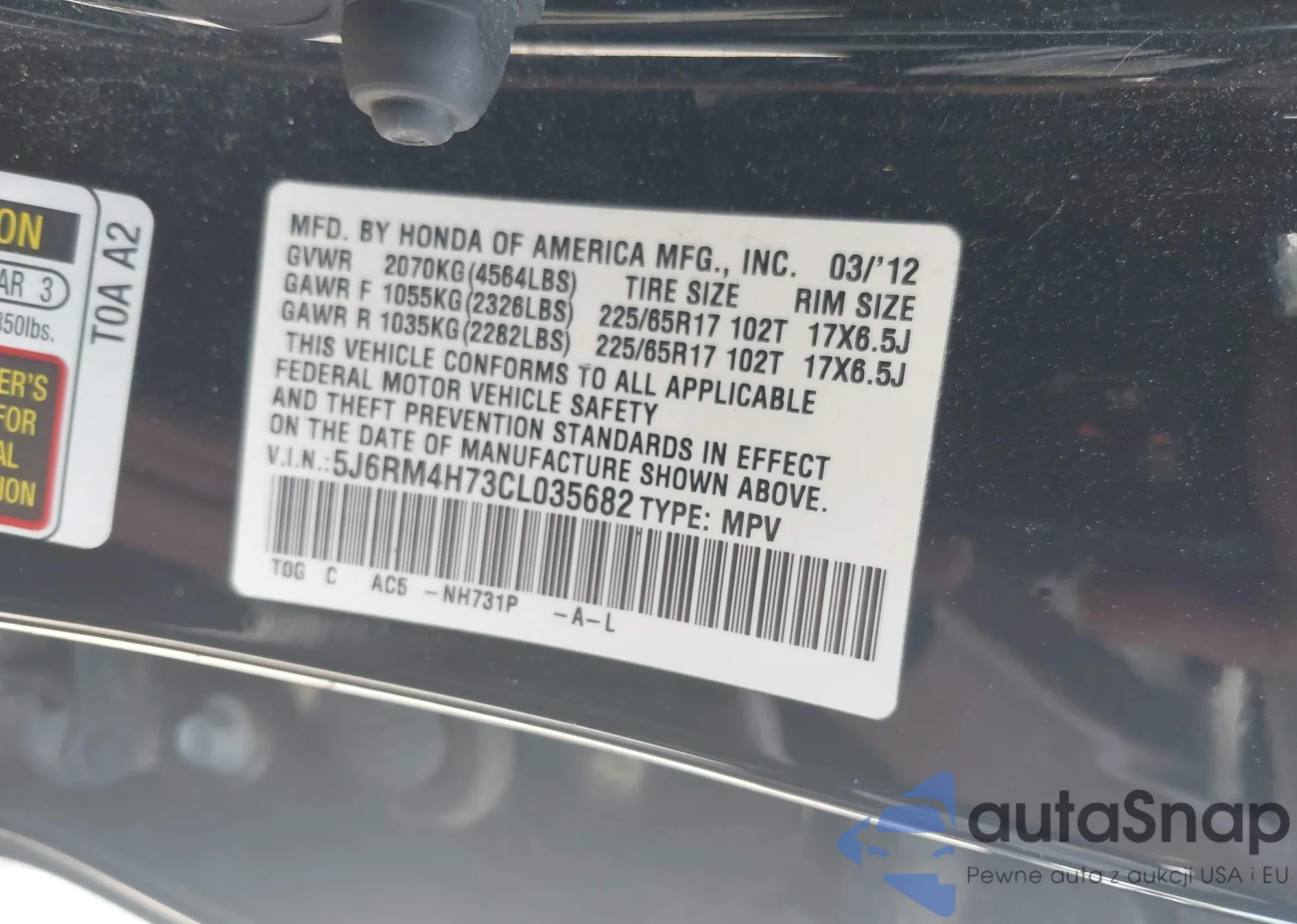 • VIN 5J6RM4H73CL035682