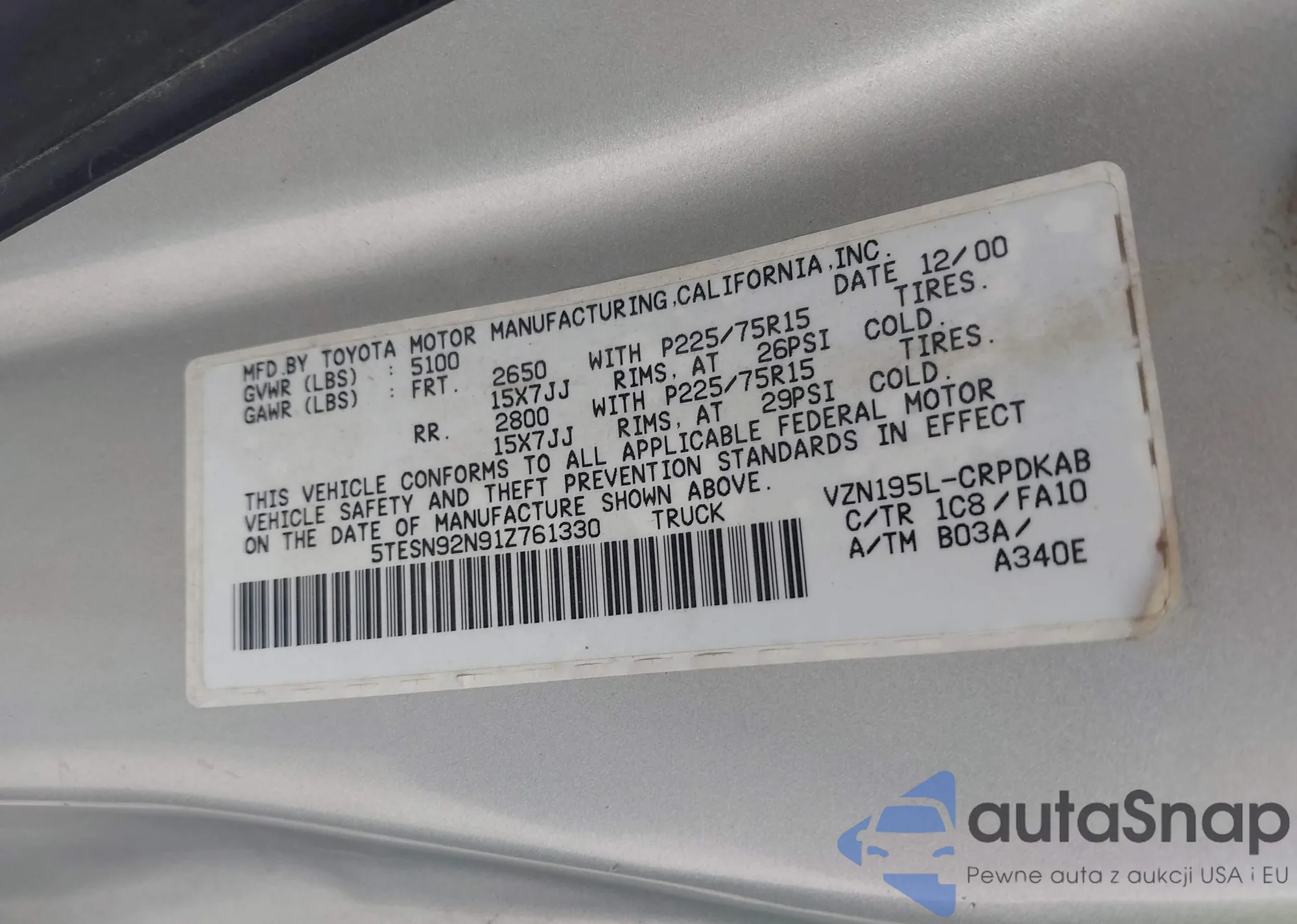 • VIN 5TESN92N91Z761330