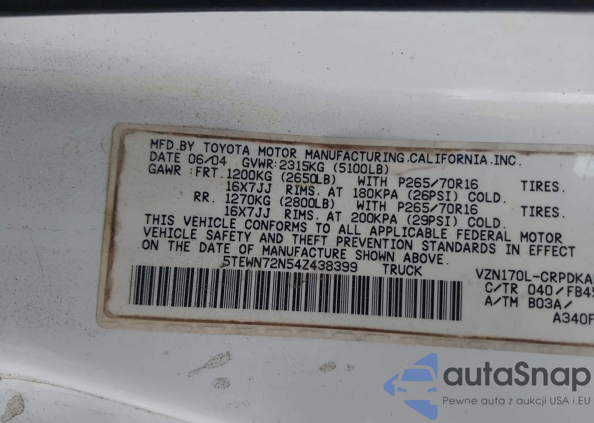 • VIN 5TEWN72N54Z438399