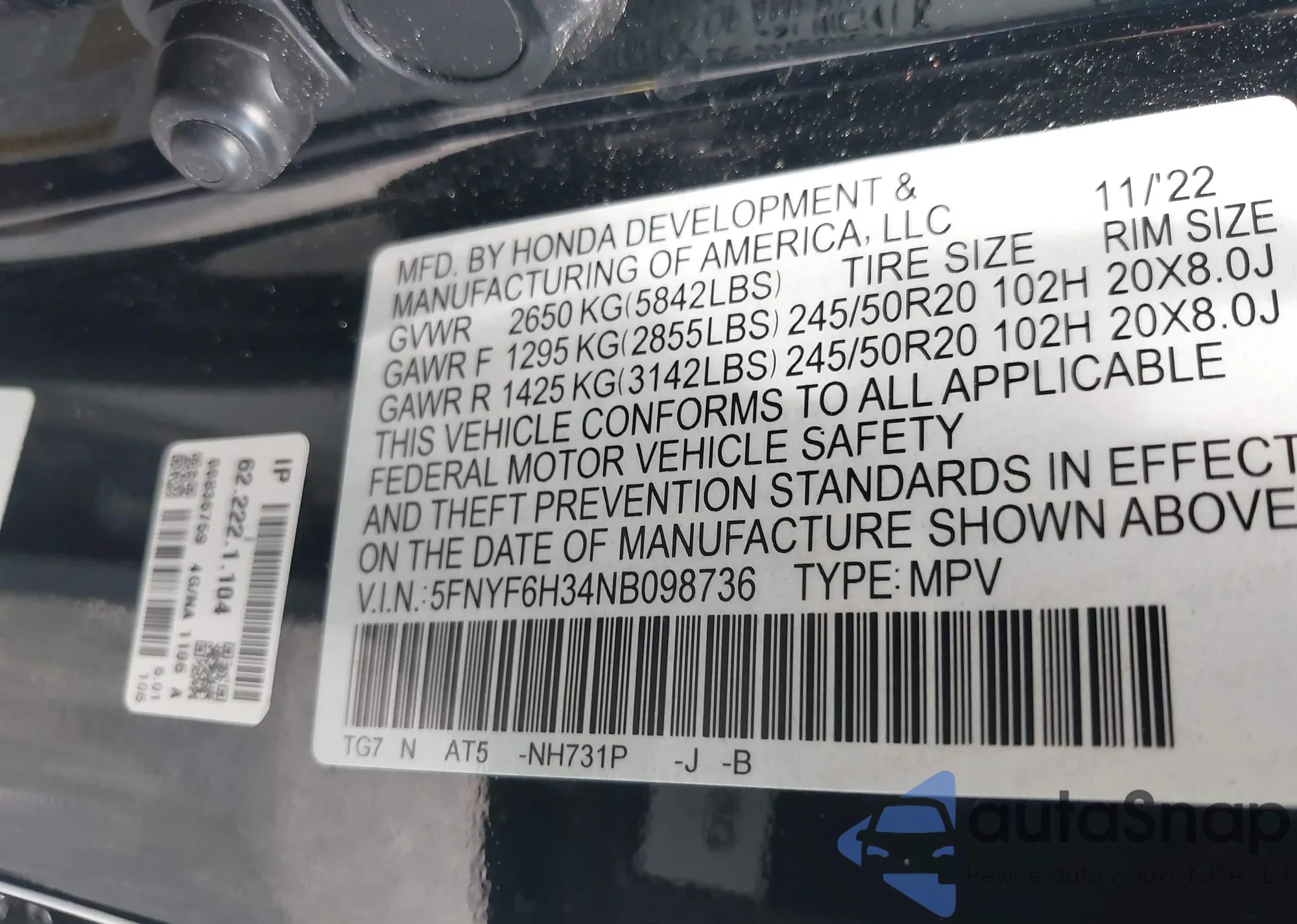 LOT: 42985908 VIN: 5FNYF6H34NB098736