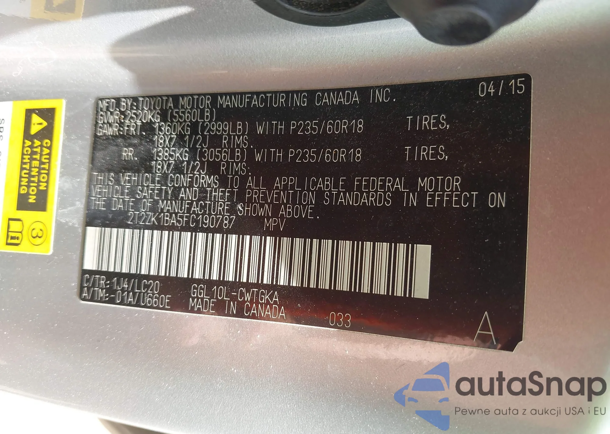 • VIN 2T2ZK1BA5FC190787