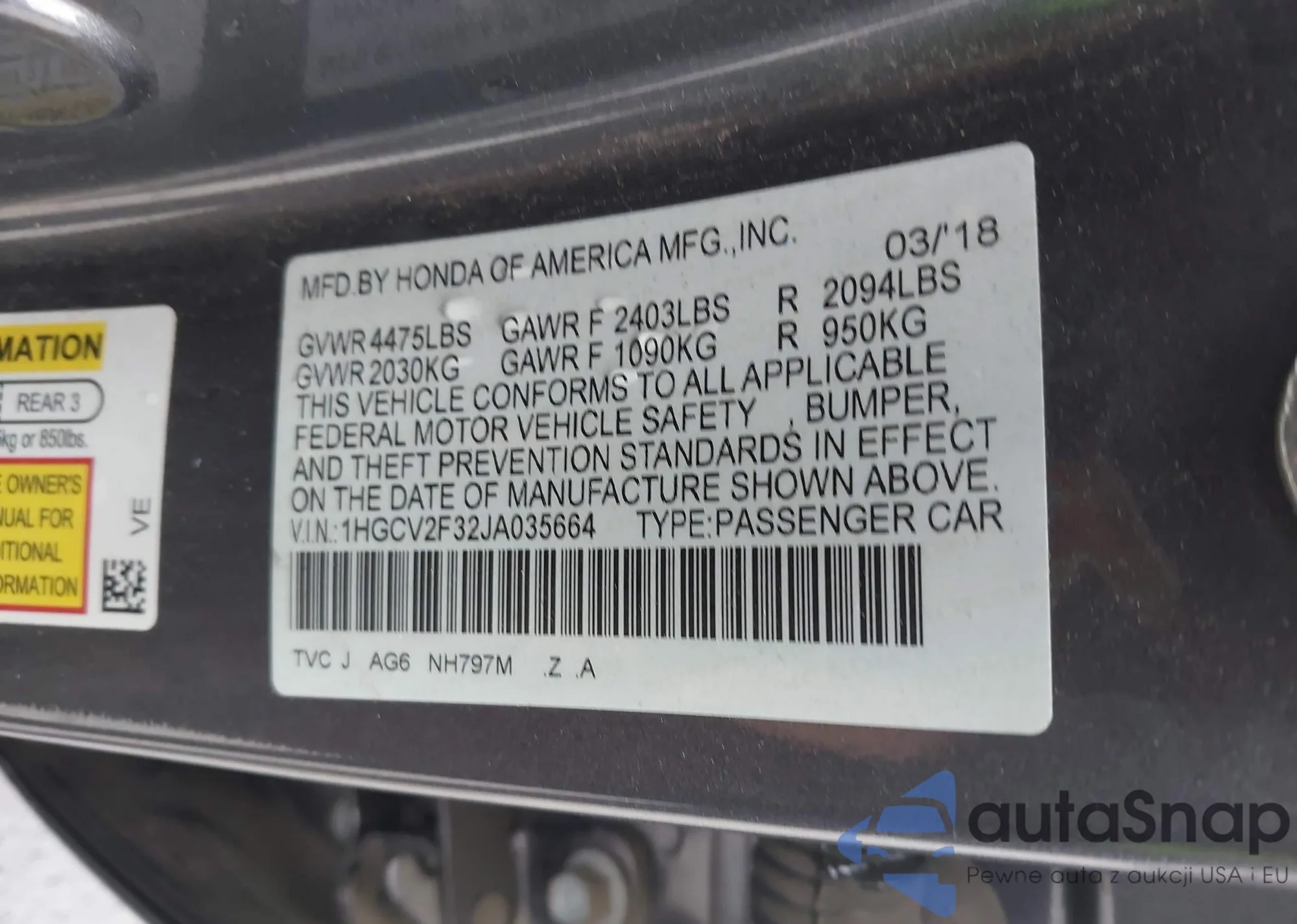 LOT: 43076177 VIN: 1HGCV2F32JA035664